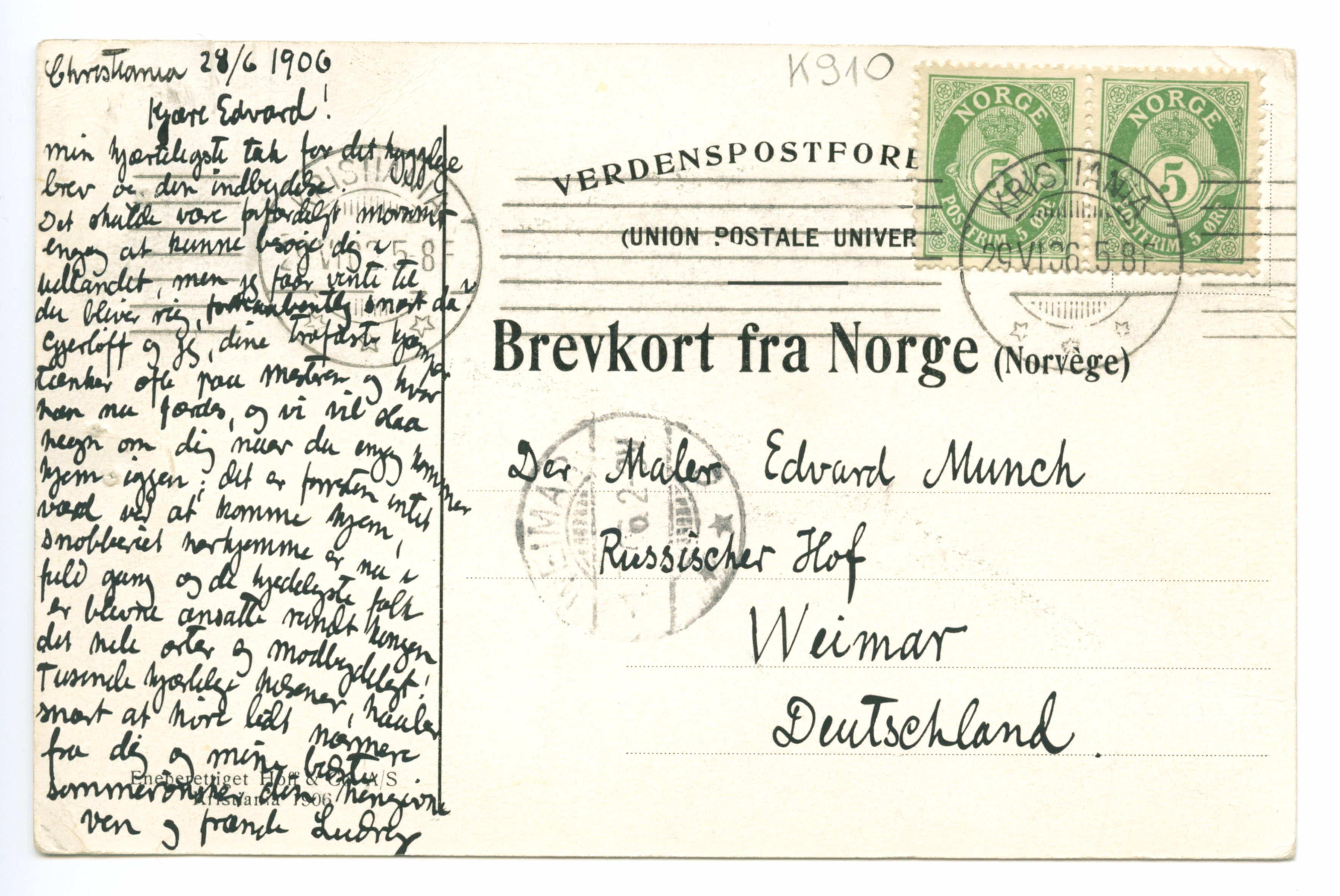 MM K 910, Munchmuseet. Datert 28.06.1906. Brev fra Ludvig Ravensberg.