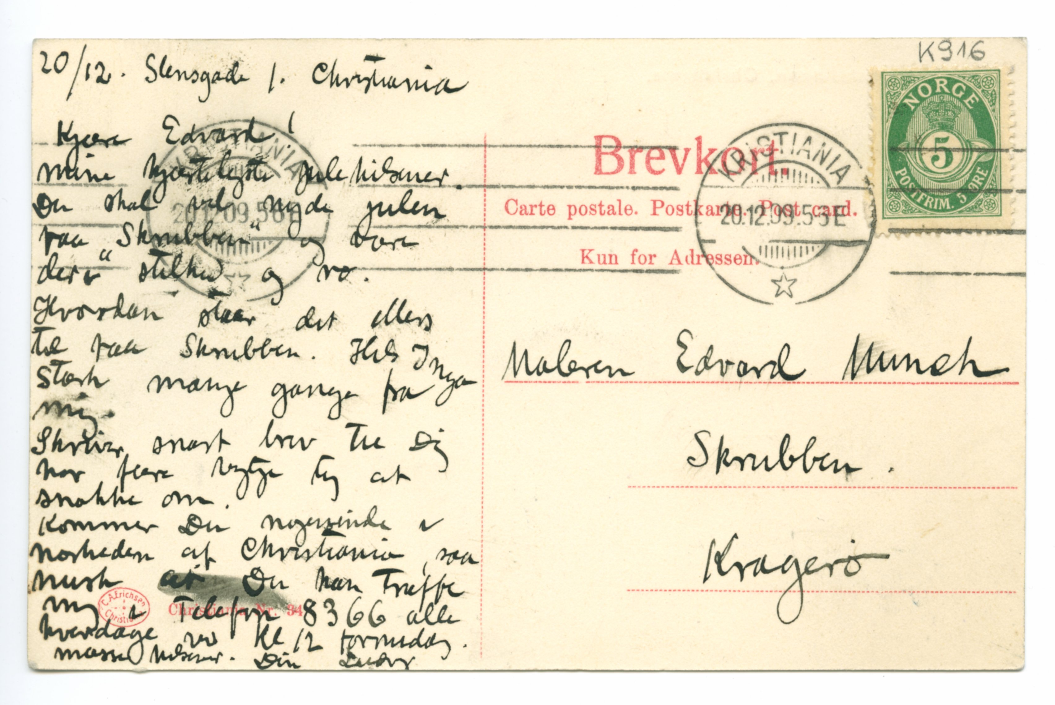MM K 916, Munchmuseet. Datert 20.12.1909. Brev fra Ludvig Ravensberg.