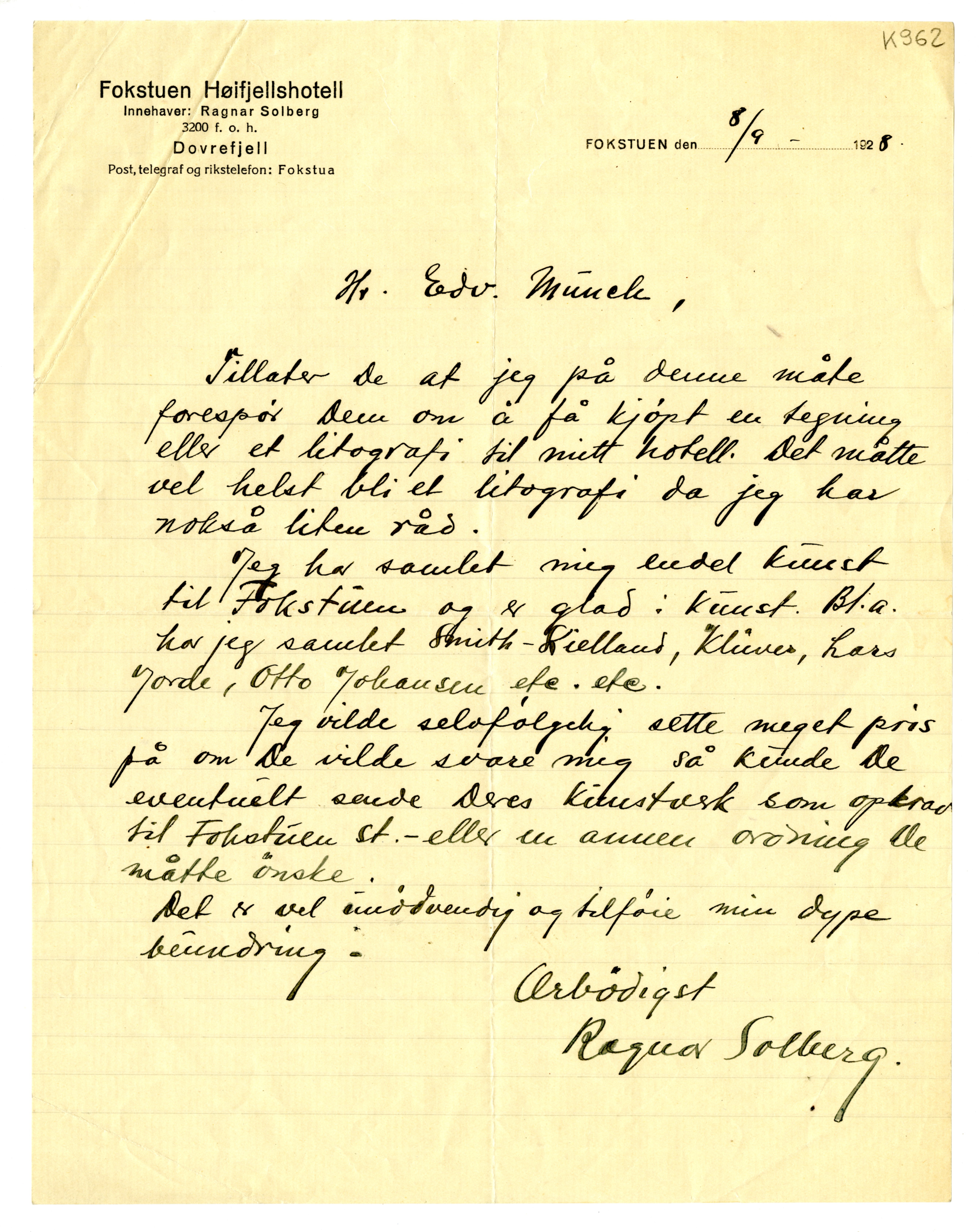 MM K 962, Munchmuseet. Datert 08.09.1928. Brev fra Ragnar Solberg, Fokstuen Høifjellshotell.