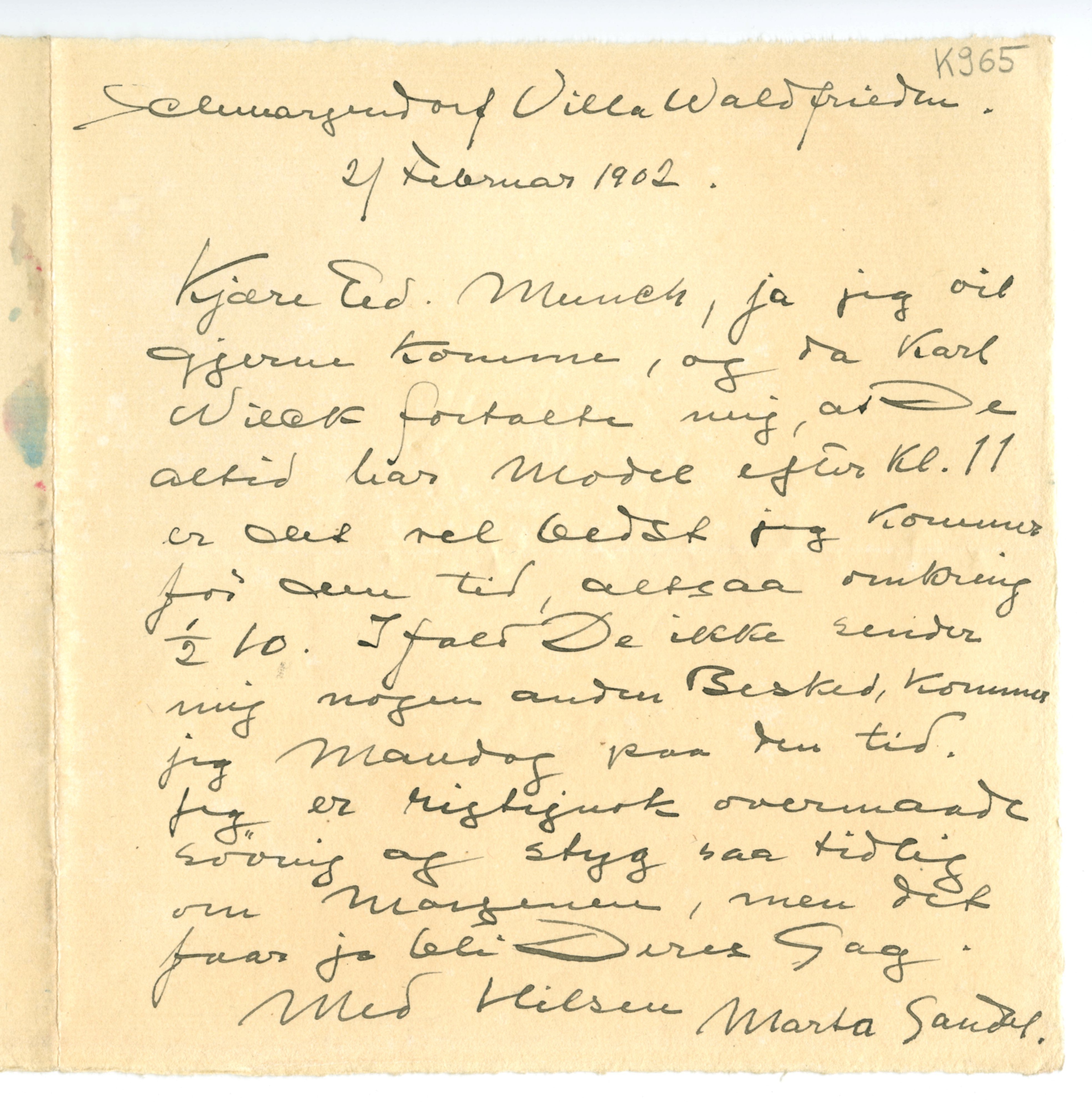 MM K 965, Munchmuseet. Datert 21.02.1902. Brev fra Marta Sandal.