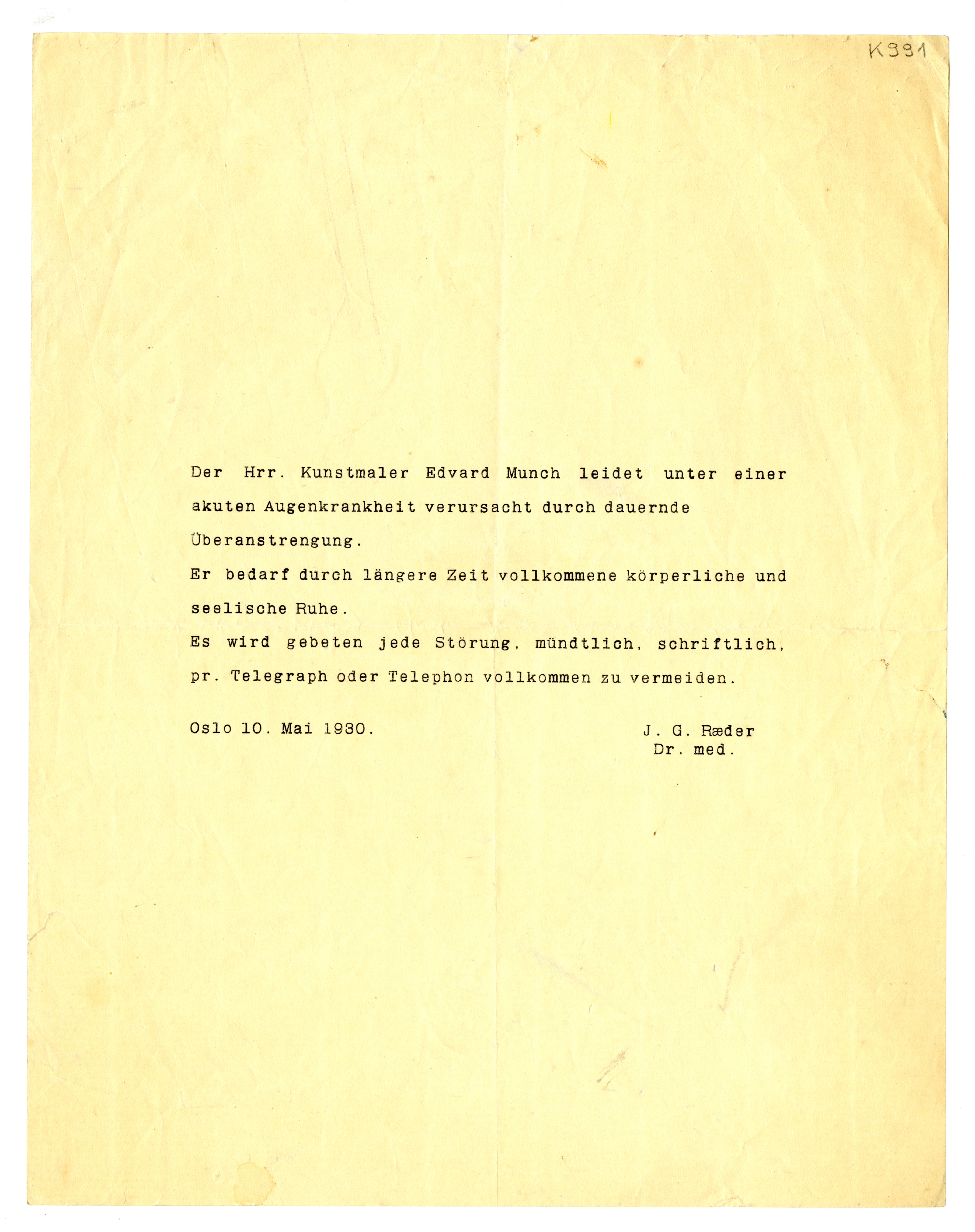 MM K 991, Munchmuseet. Datert 27.09.1930. Brev fra Johan Ræder.