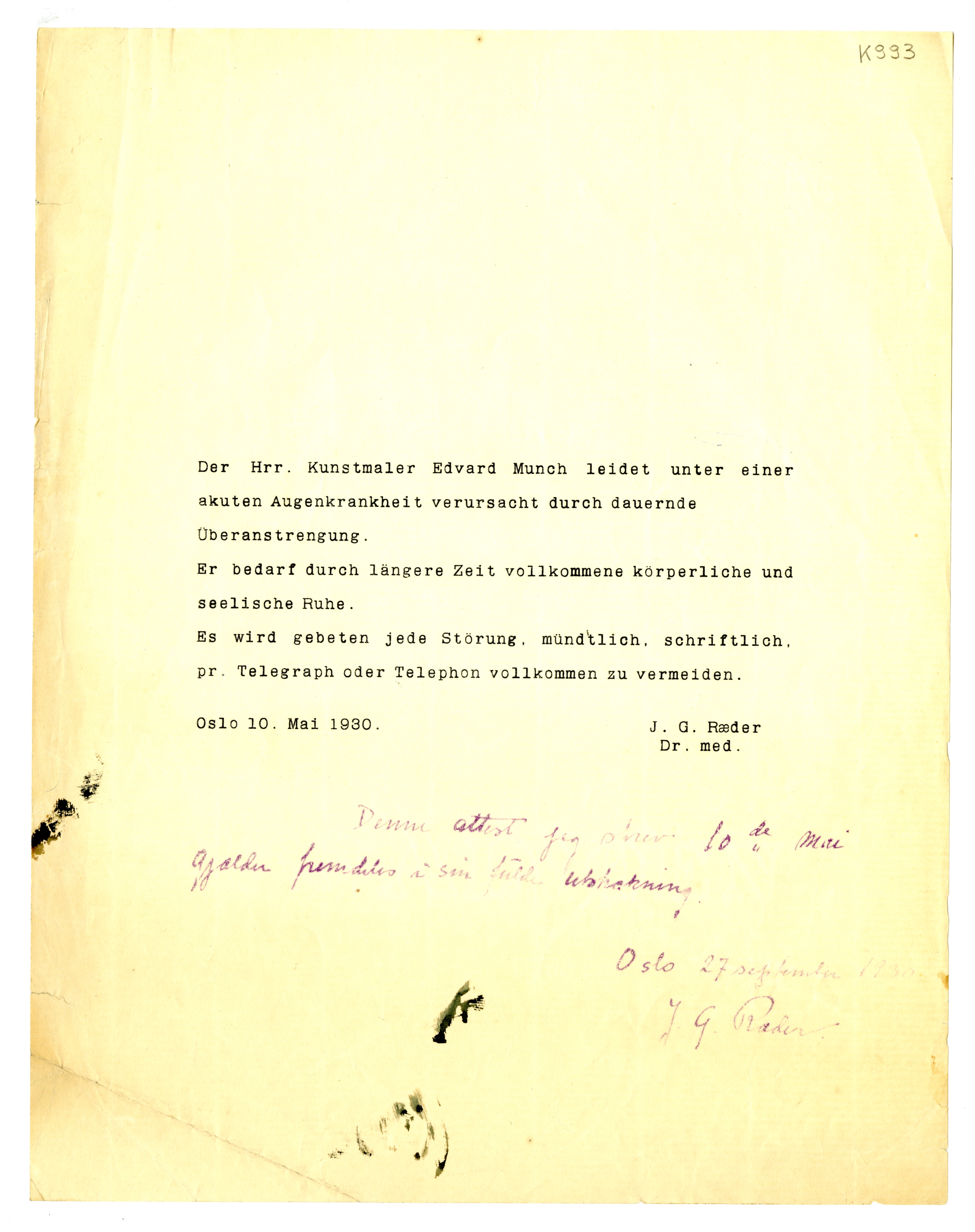 MM K 993, Munchmuseet. Datert 27.09.1930. Brev fra Johan Ræder.