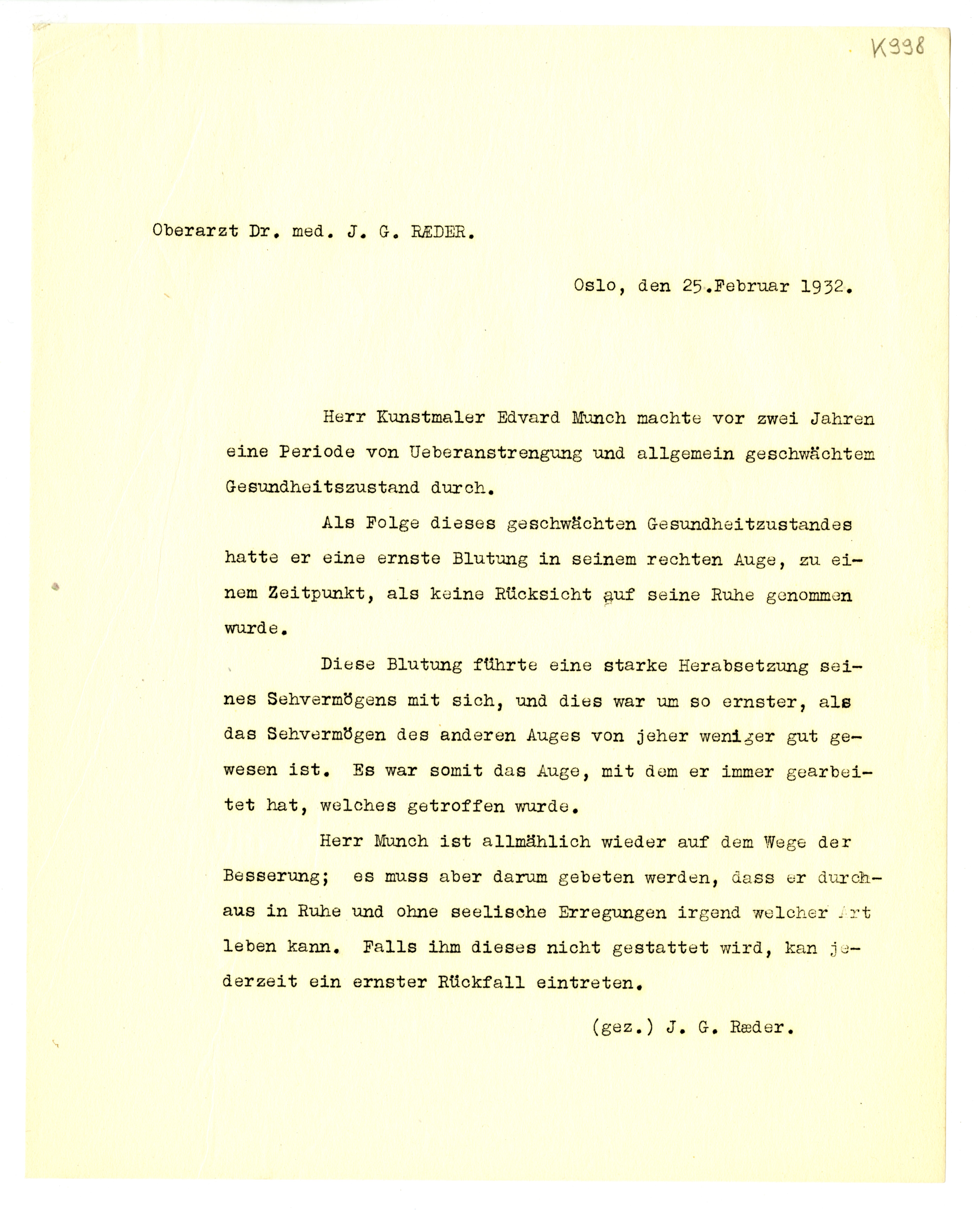 MM K 998, Munchmuseet. Datert 25.02.1932. Brev fra Johan Ræder.