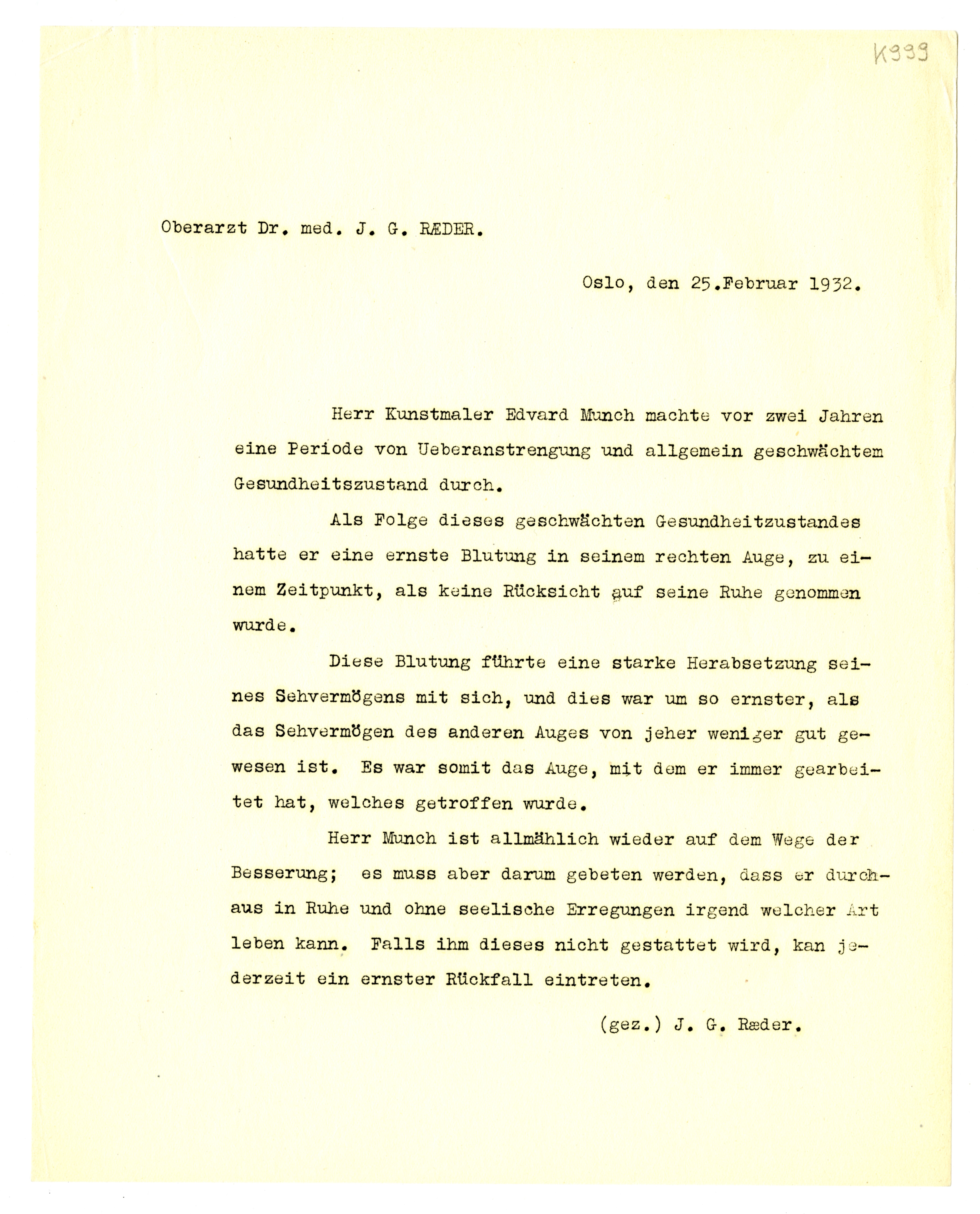 MM K 999, Munchmuseet. Datert 25.02.1932. Brev fra Johan Ræder.