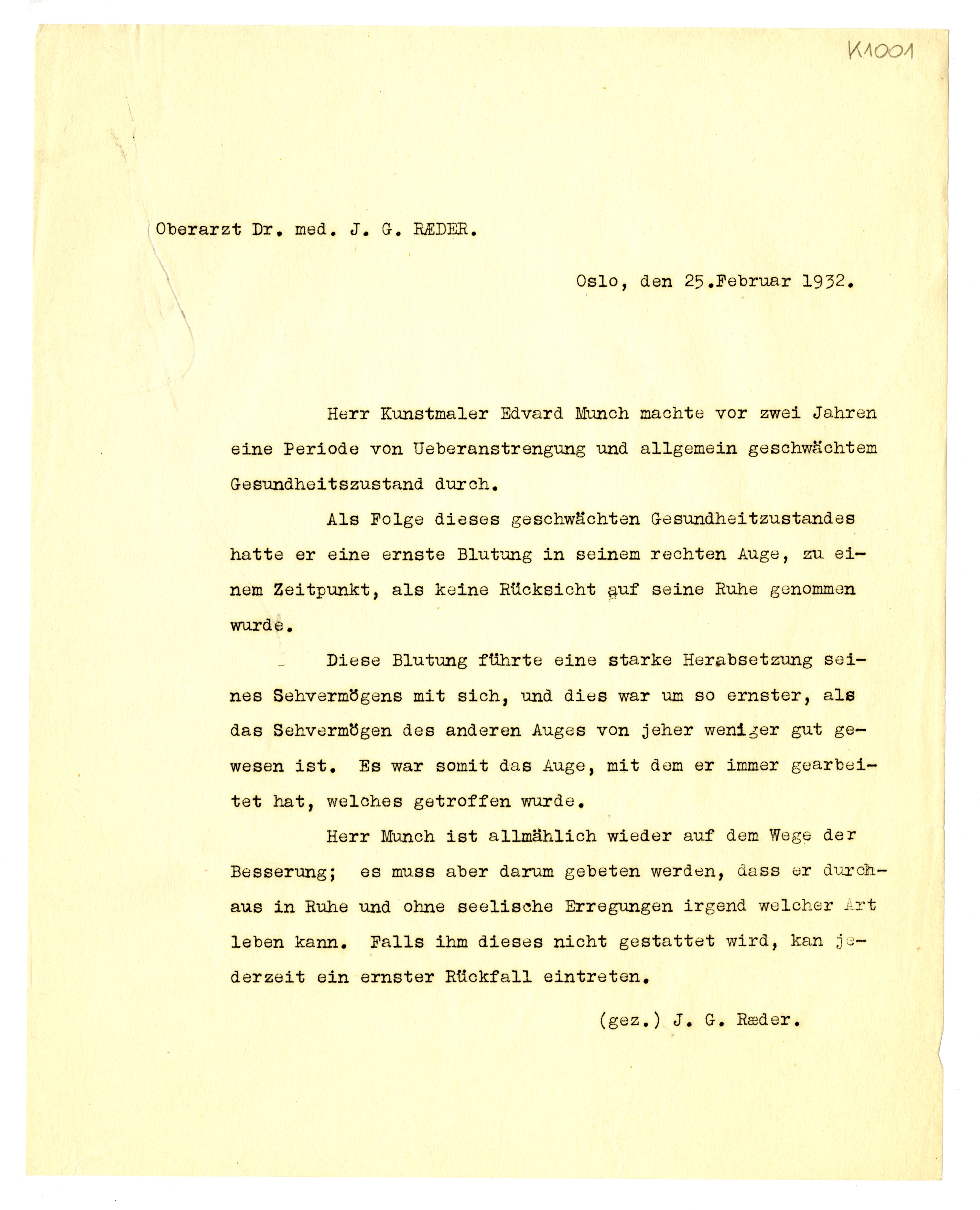 MM K 1001, Munchmuseet. Datert 25.02.1932. Brev fra Johan Ræder.