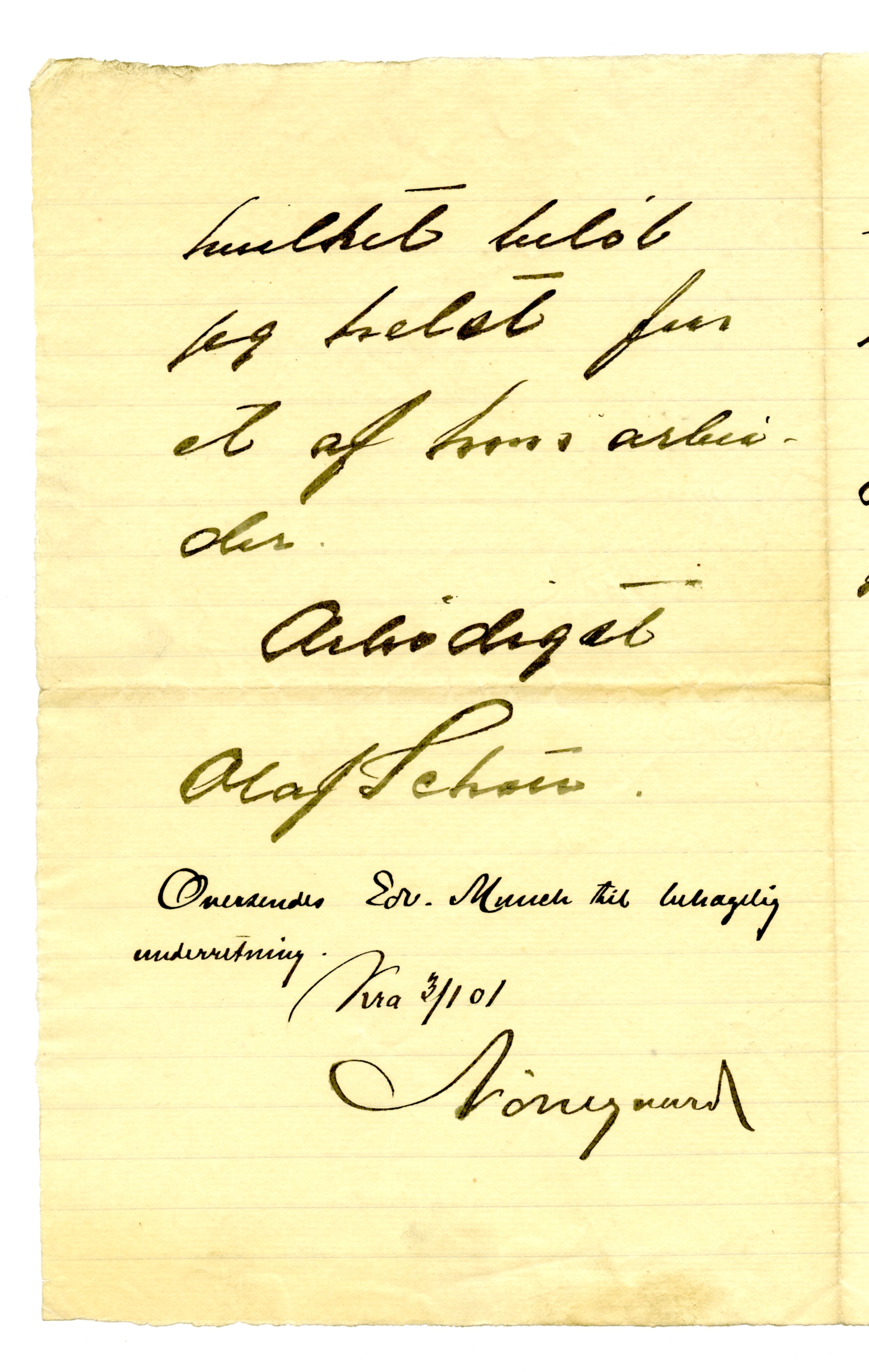 Filologisk kommentar: Brevet er fra Olaf Schou til Harald Nørregaard, og Schou ber Nørregaard formidle videre til Munch. Med påskrift fra Nørregaard.