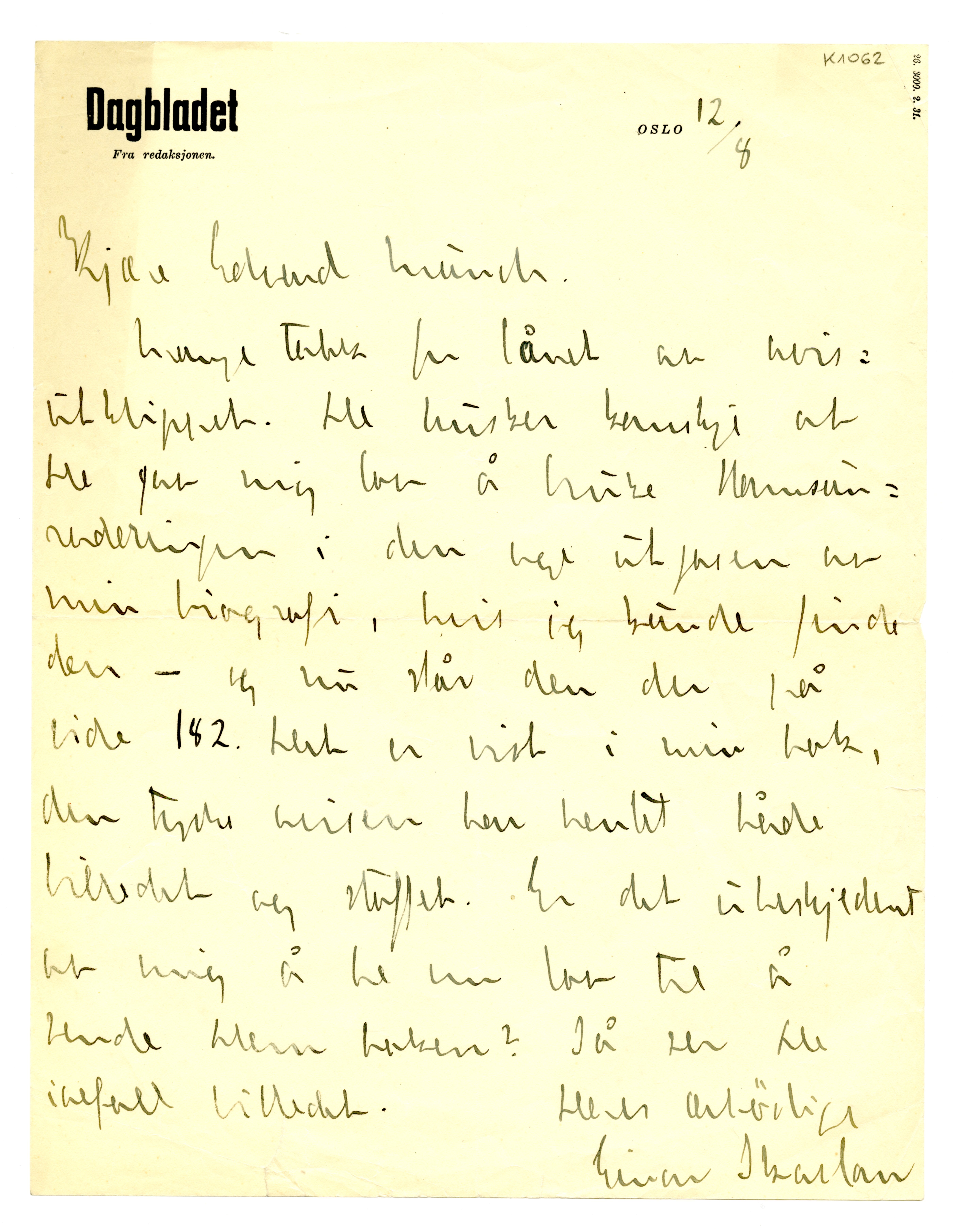 MM K 1062, Munchmuseet. Datert 12.08.1[???]. Brev fra Einar Skavlan, Dagbladet.