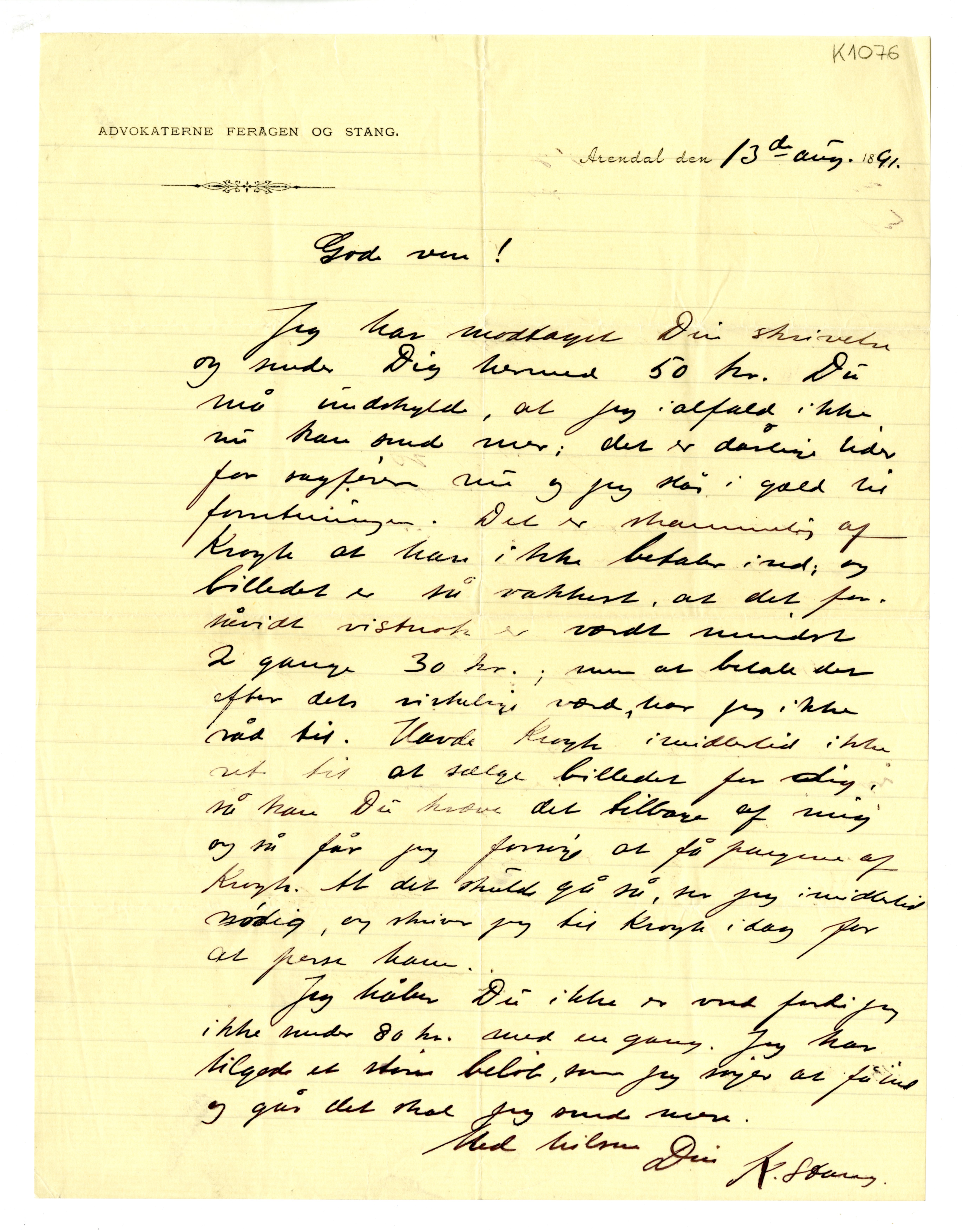 MM K 1076, Munchmuseet. Datert 13.08.1891. Brev fra Klemens Stang.