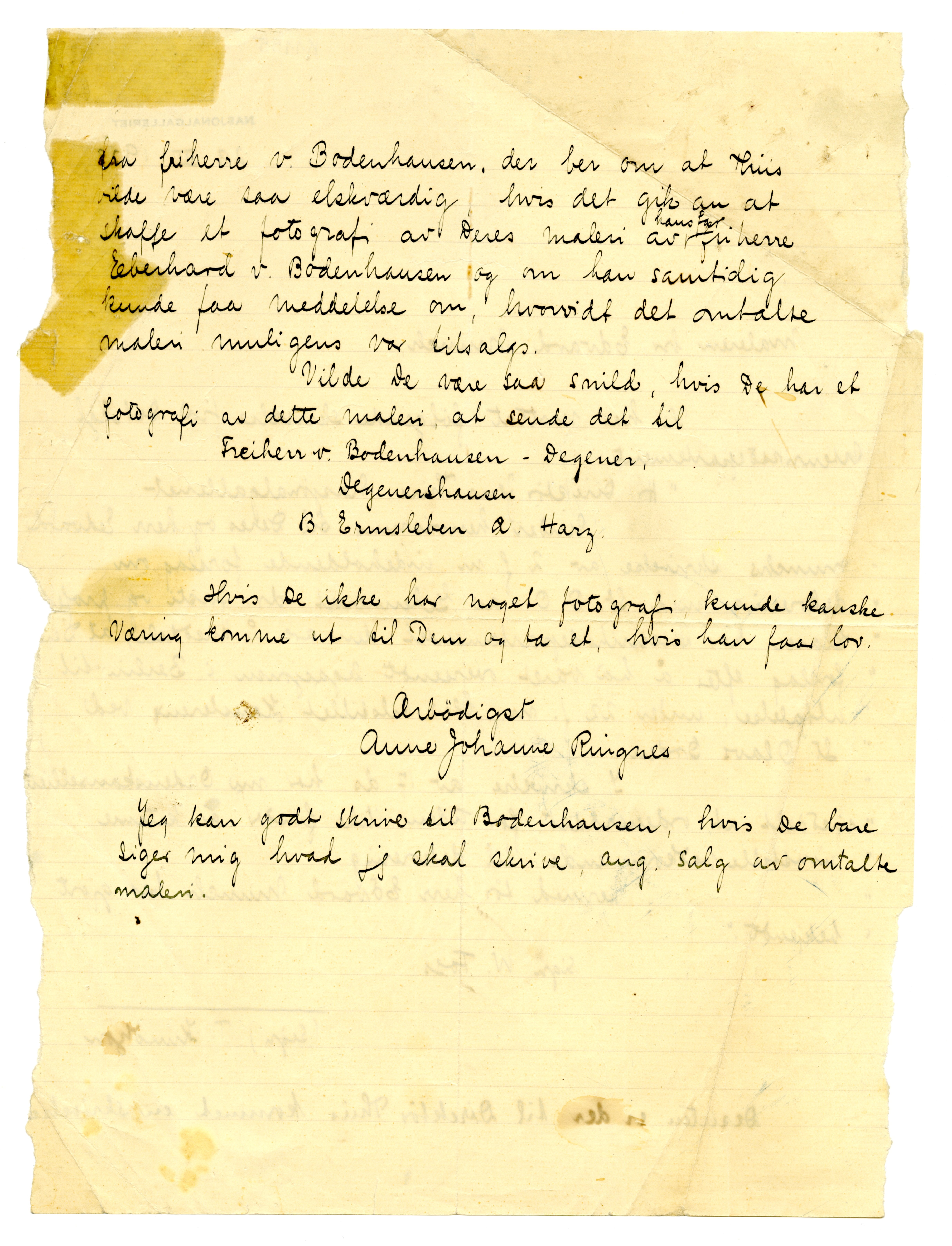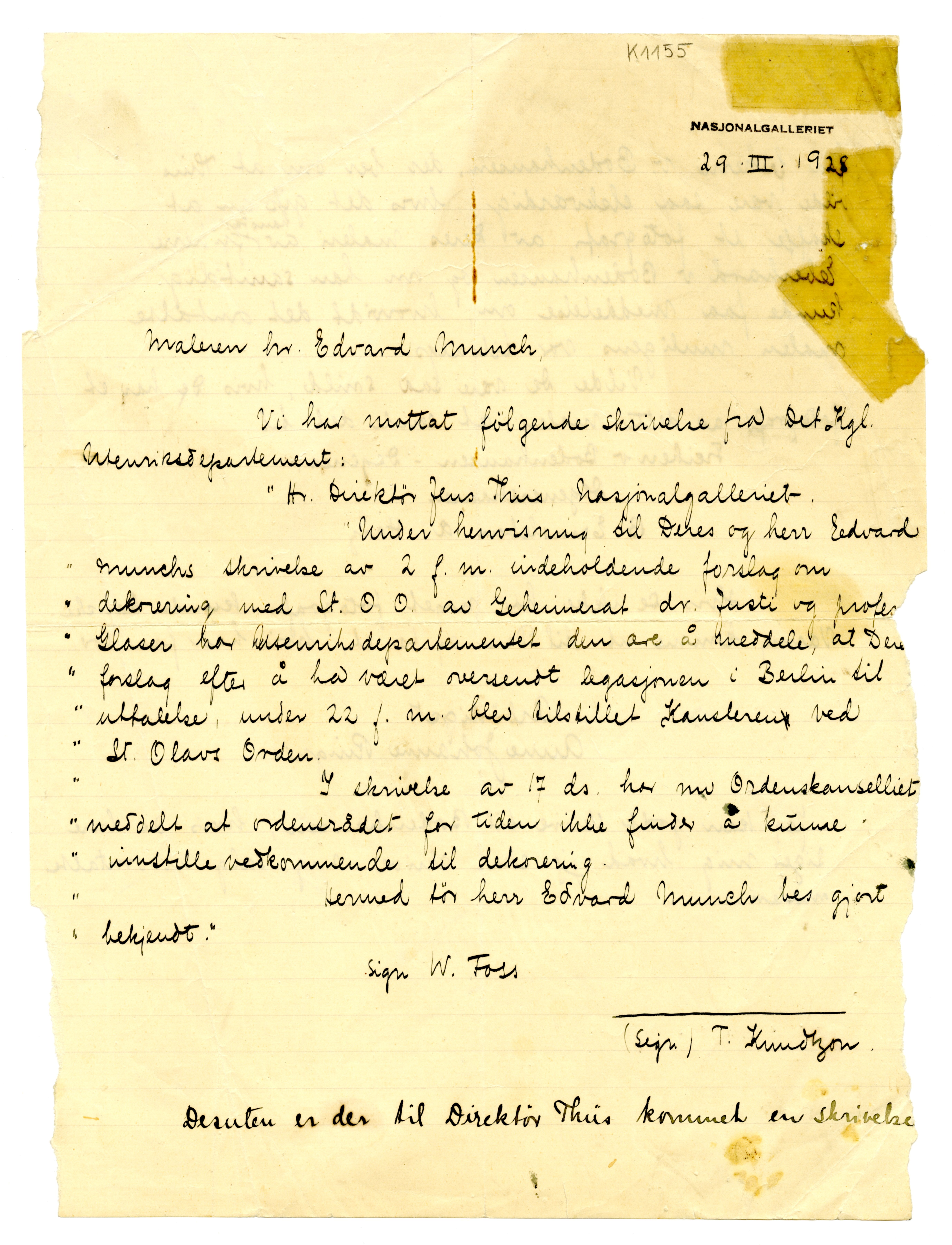 MM K 1155, Munchmuseet. Datert 29.03.1928. Brev fra Nasjonalgalleriet, Anne Johanne Ringnes.