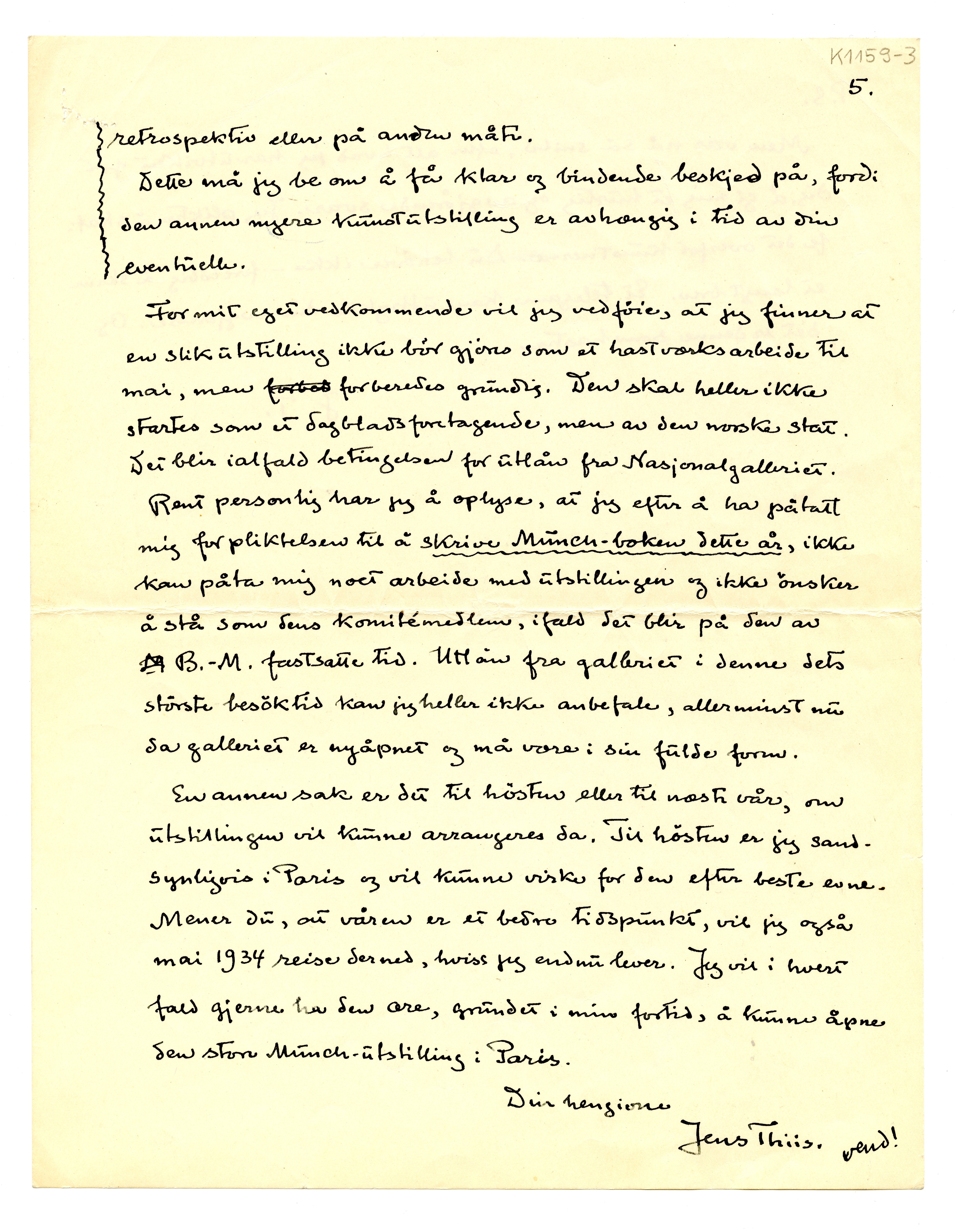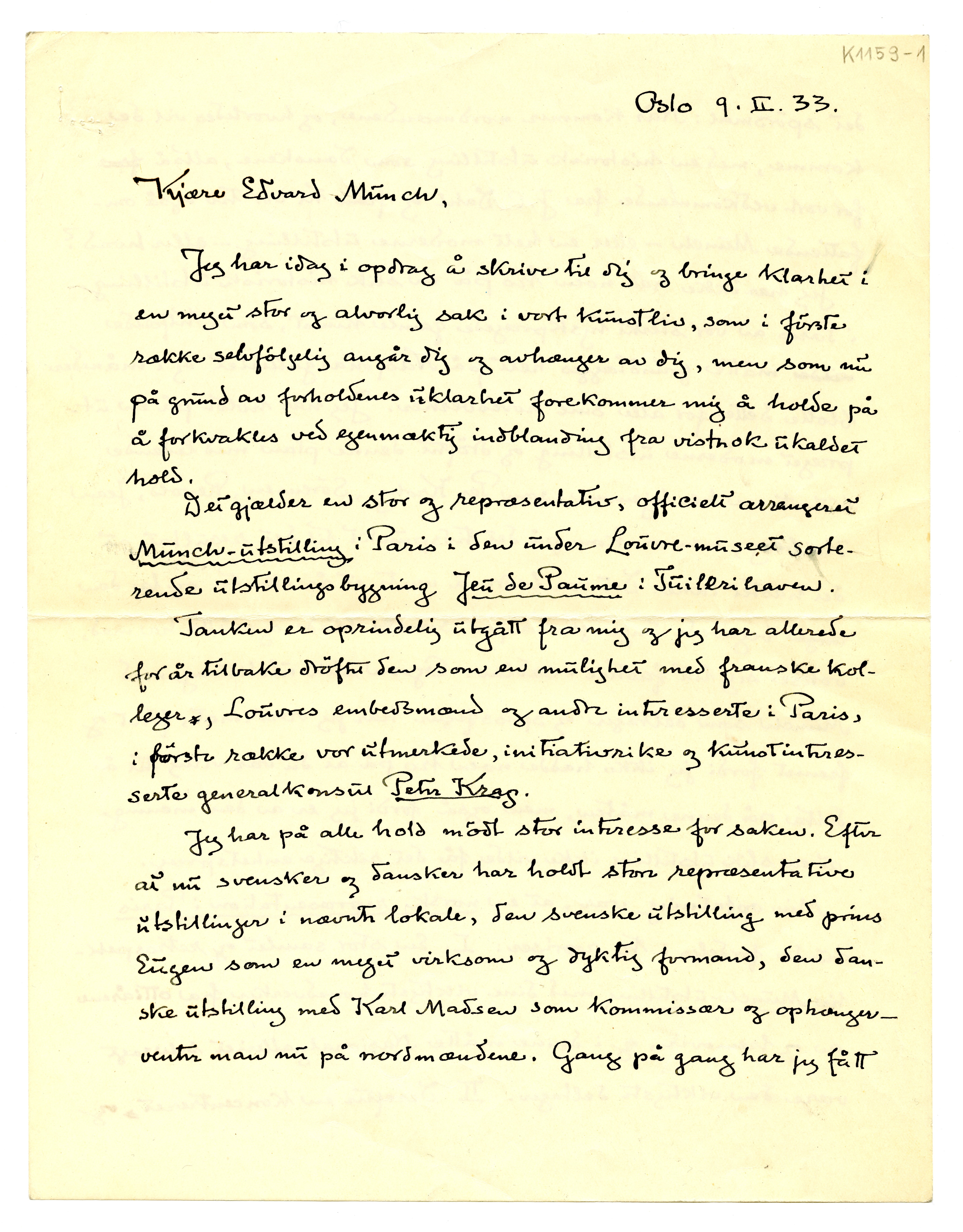 MM K 1159, Munchmuseet. Datert 09.02.1933. Brev fra Jens Thiis.