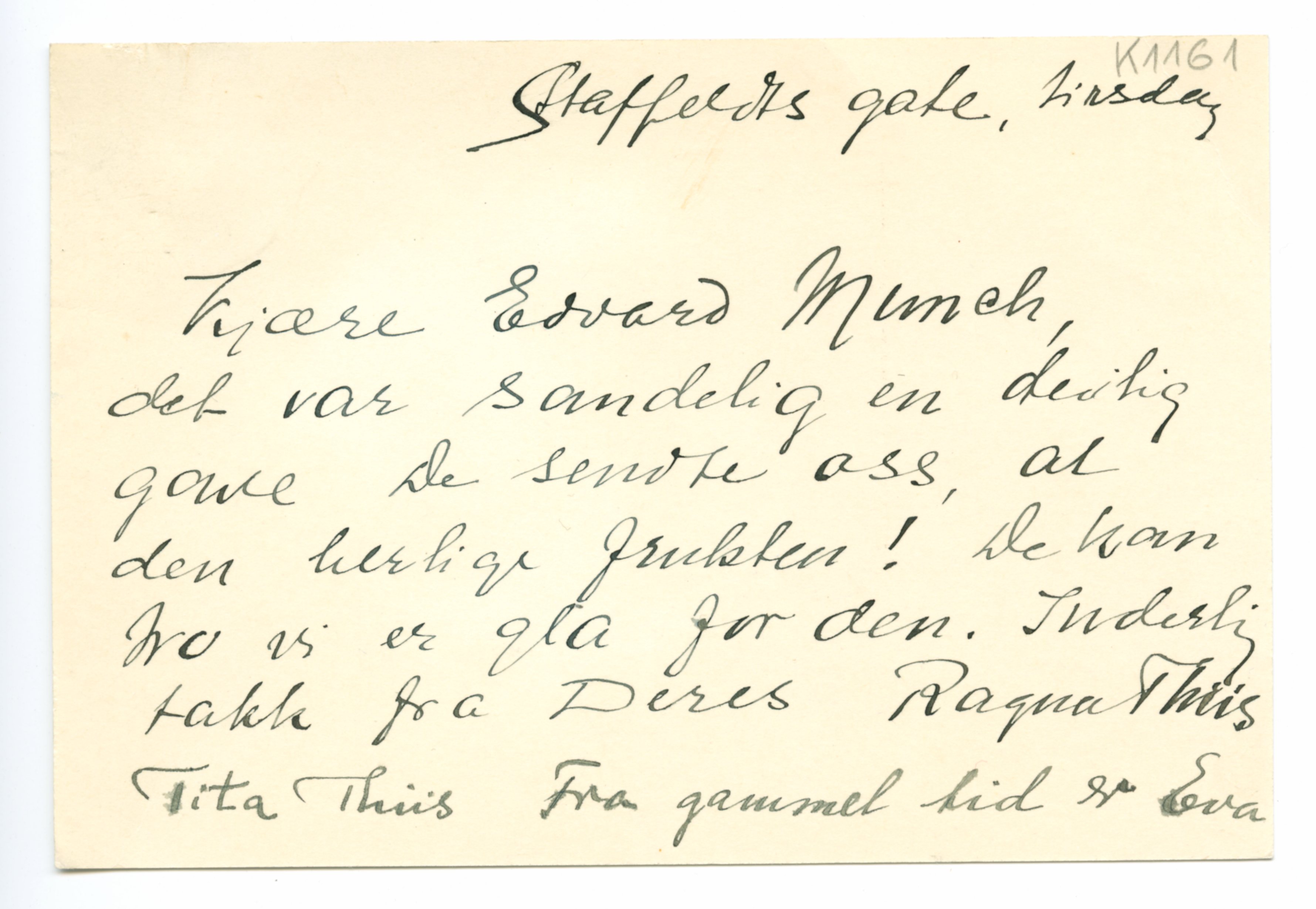 MM K 1161, Munchmuseet. Ikke datert. Brev fra Ragna Thiis, Tita Thiis.