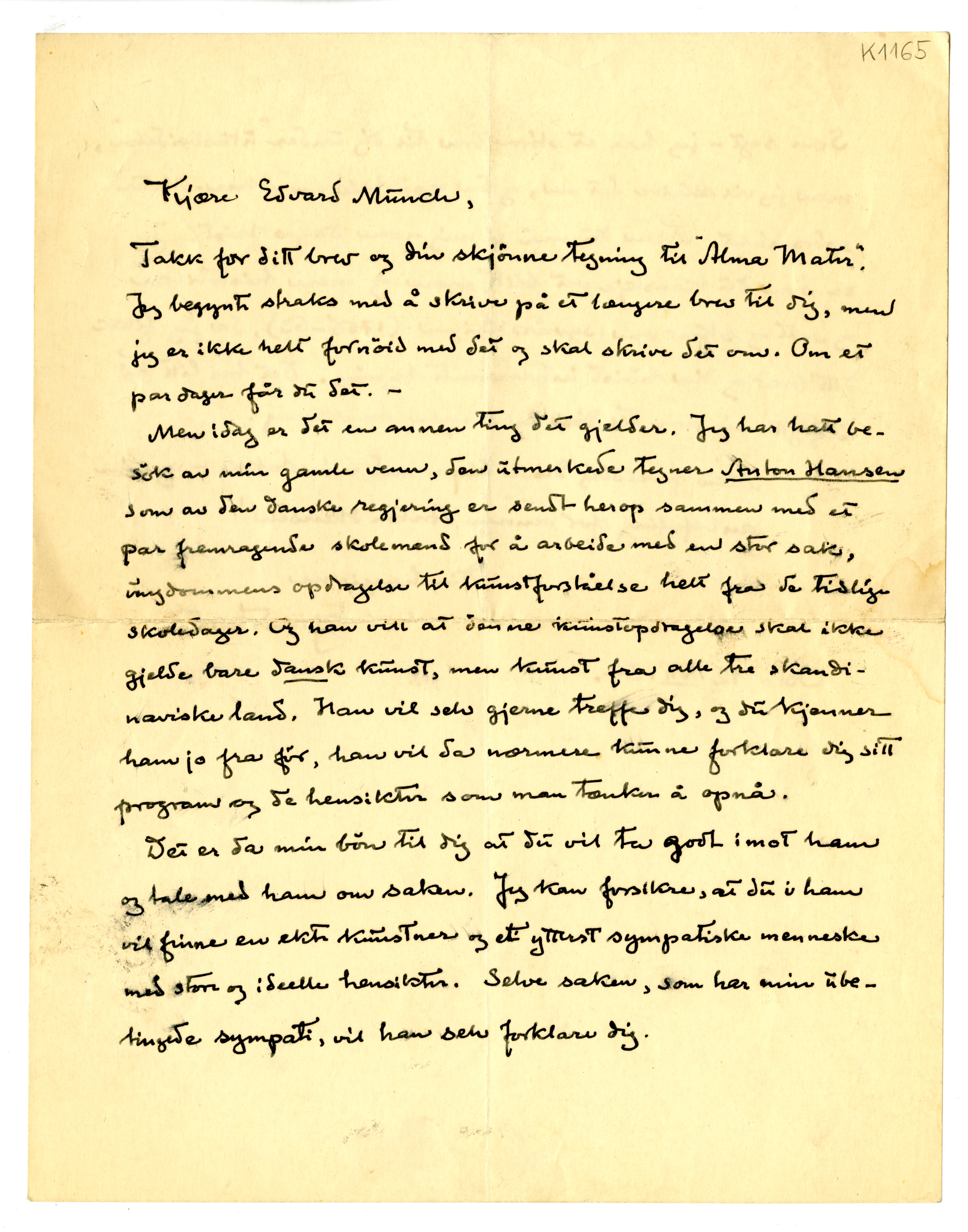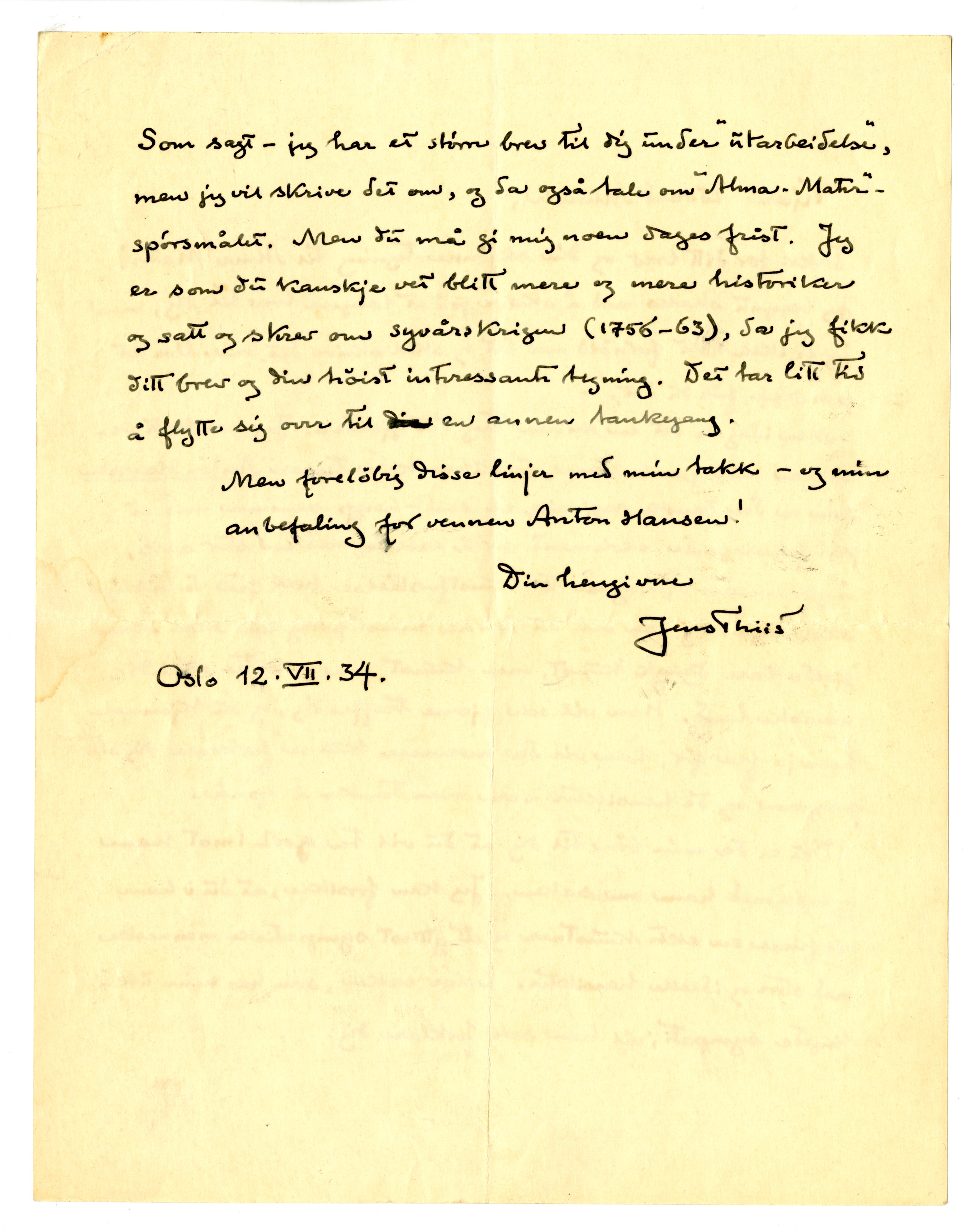 MM K 1165, Munchmuseet. Datert 12.08.1934. Brev fra Jens Thiis.