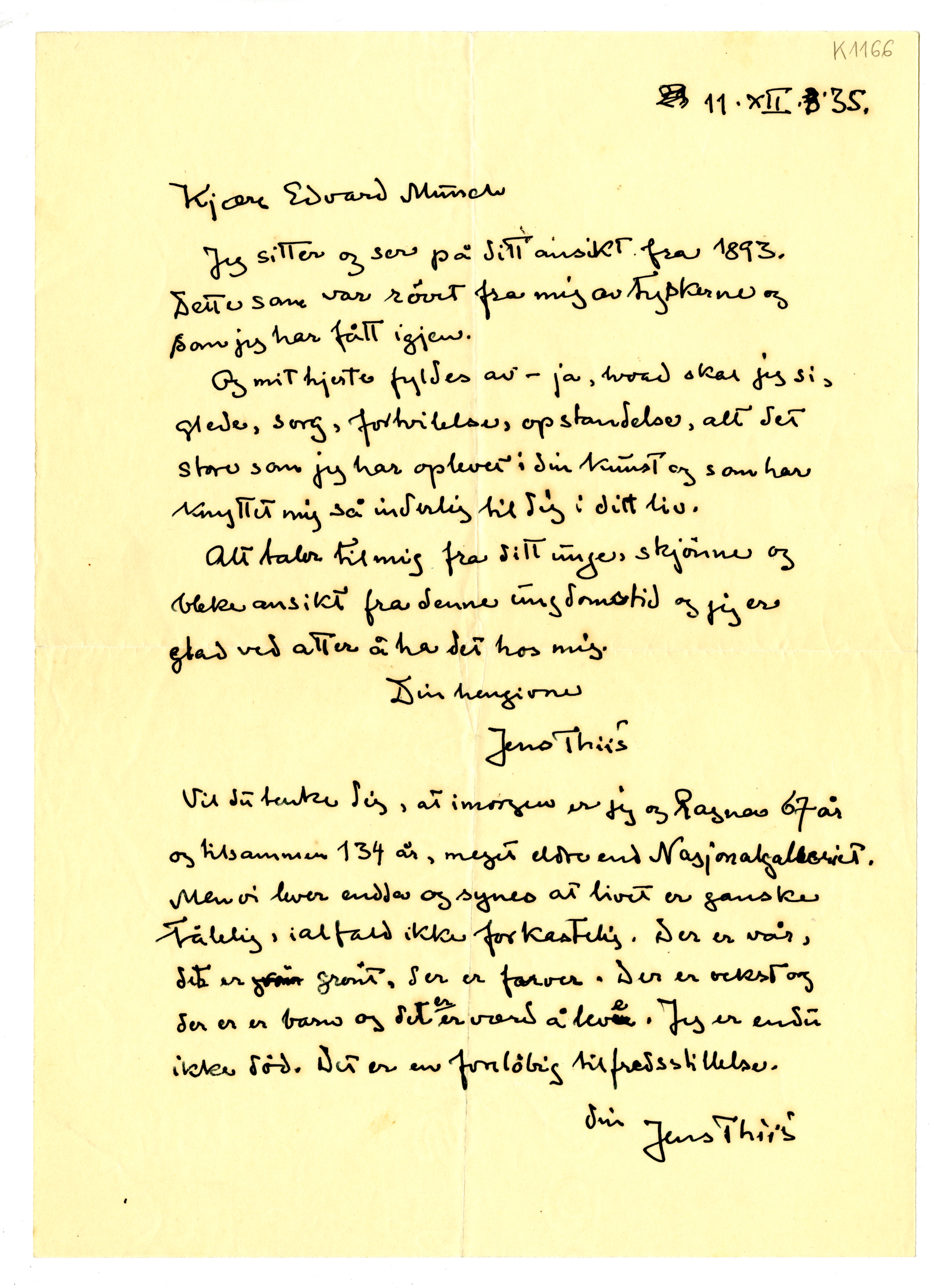 MM K 1166, Munchmuseet. Datert 11.12.1935. Brev fra Jens Thiis.