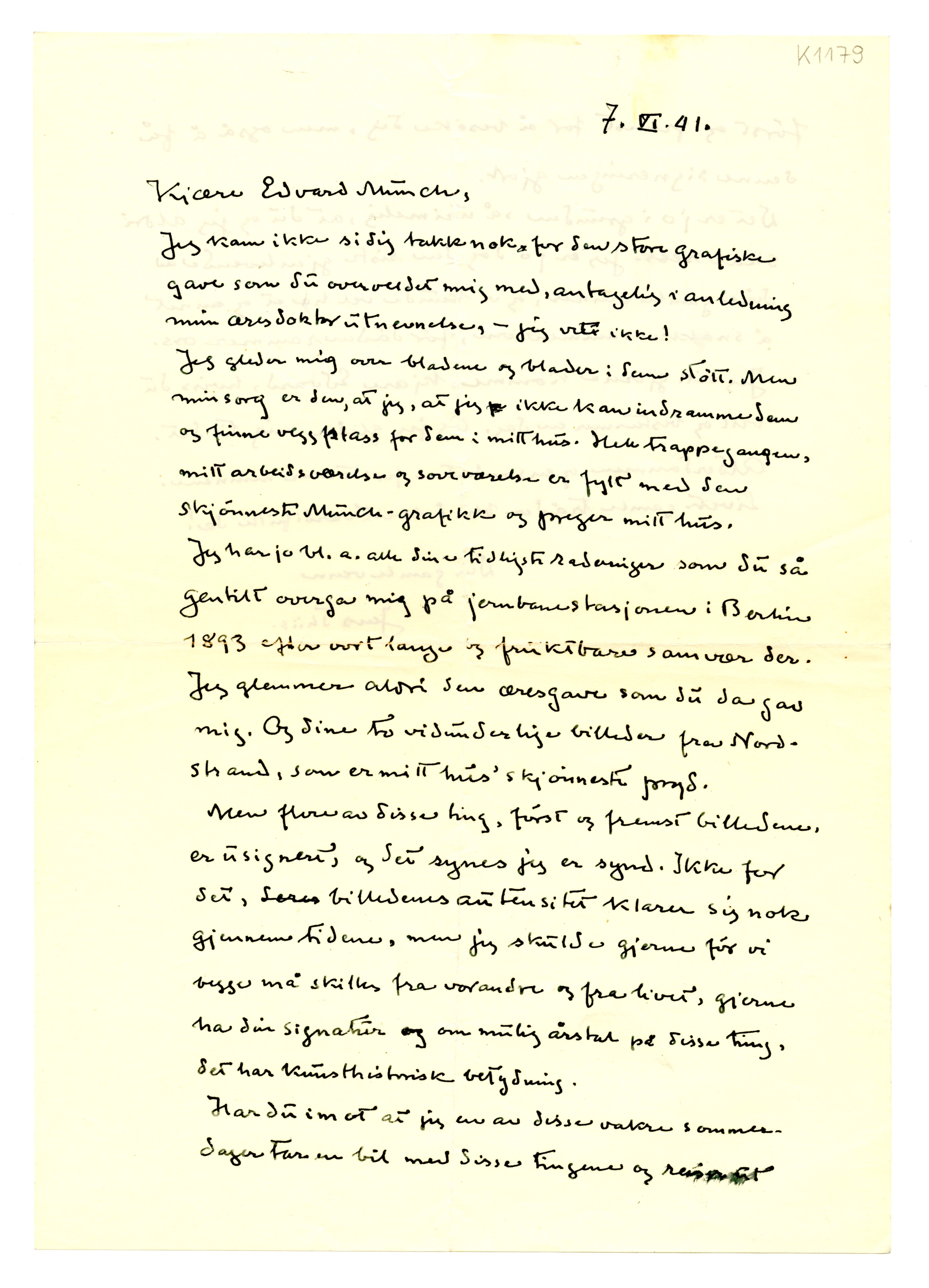 MM K 1179, Munchmuseet. Datert 07.06.1941. Brev fra Jens Thiis.