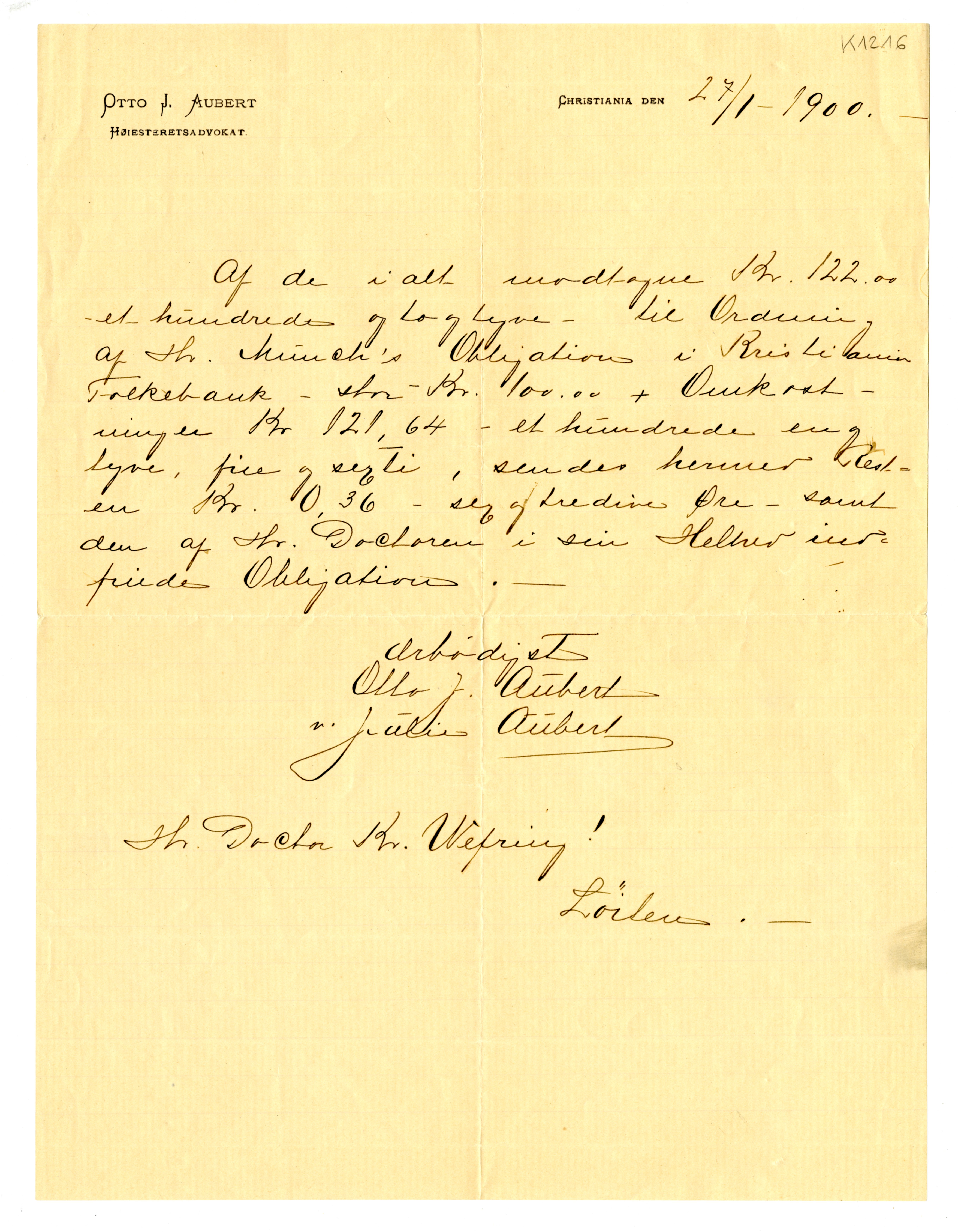 MM K 1216, Munchmuseet. Datert 27.01.1900. Brev fra Karl Wefring, Kristiania Folkebank.