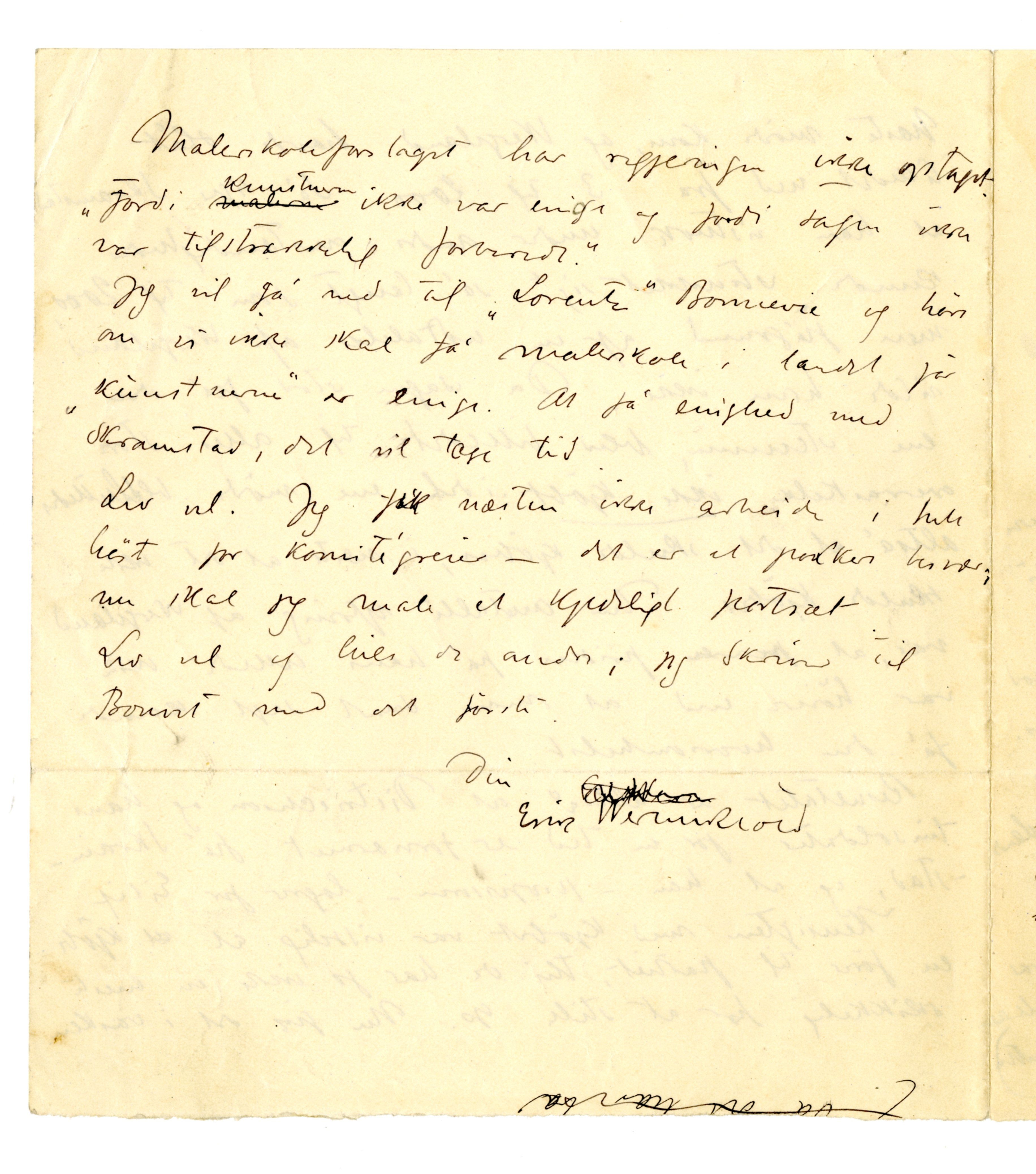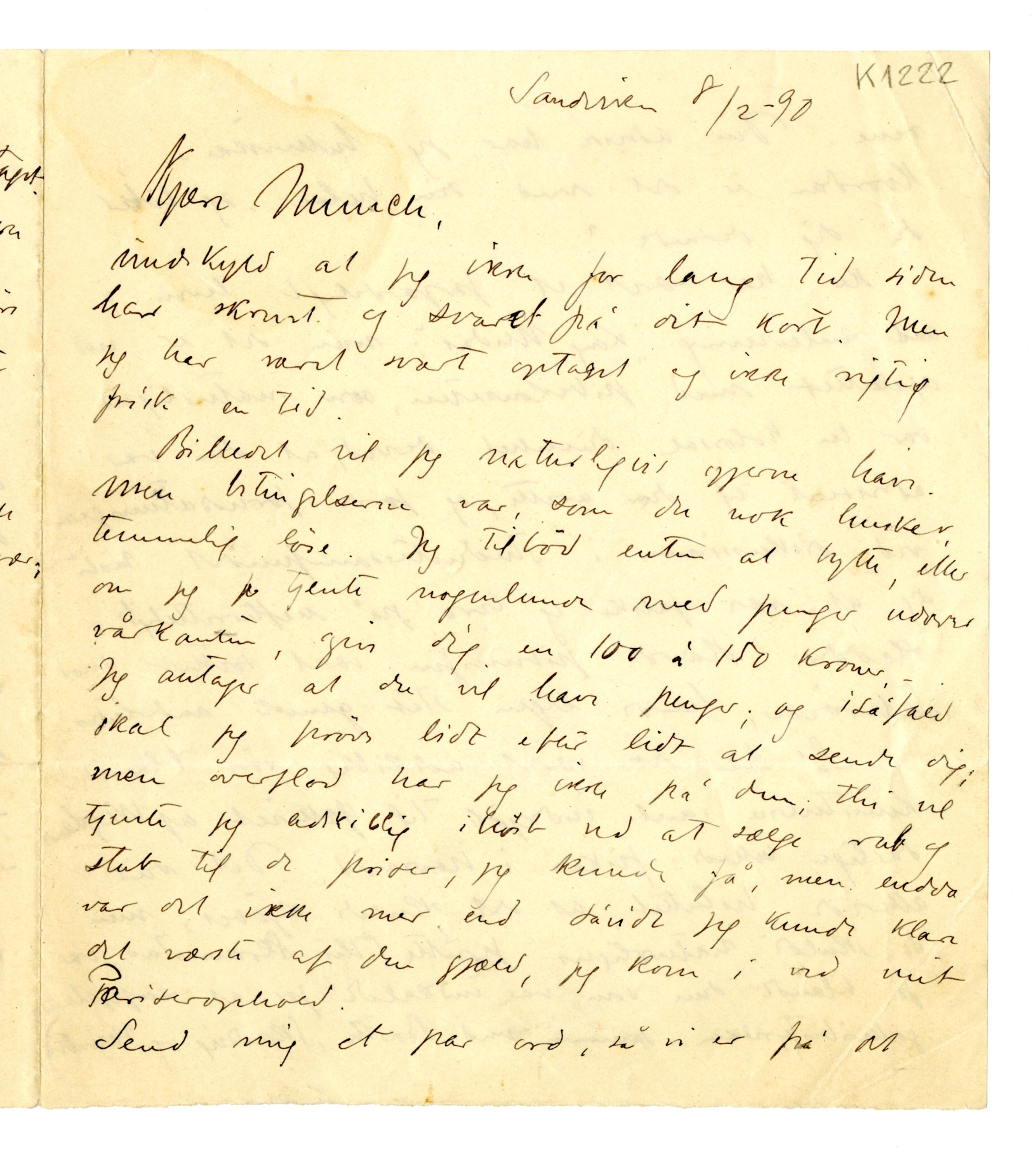 MM K 1222, Munchmuseet. Datert 08.02.1890. Brev fra Erik Werenskiold.