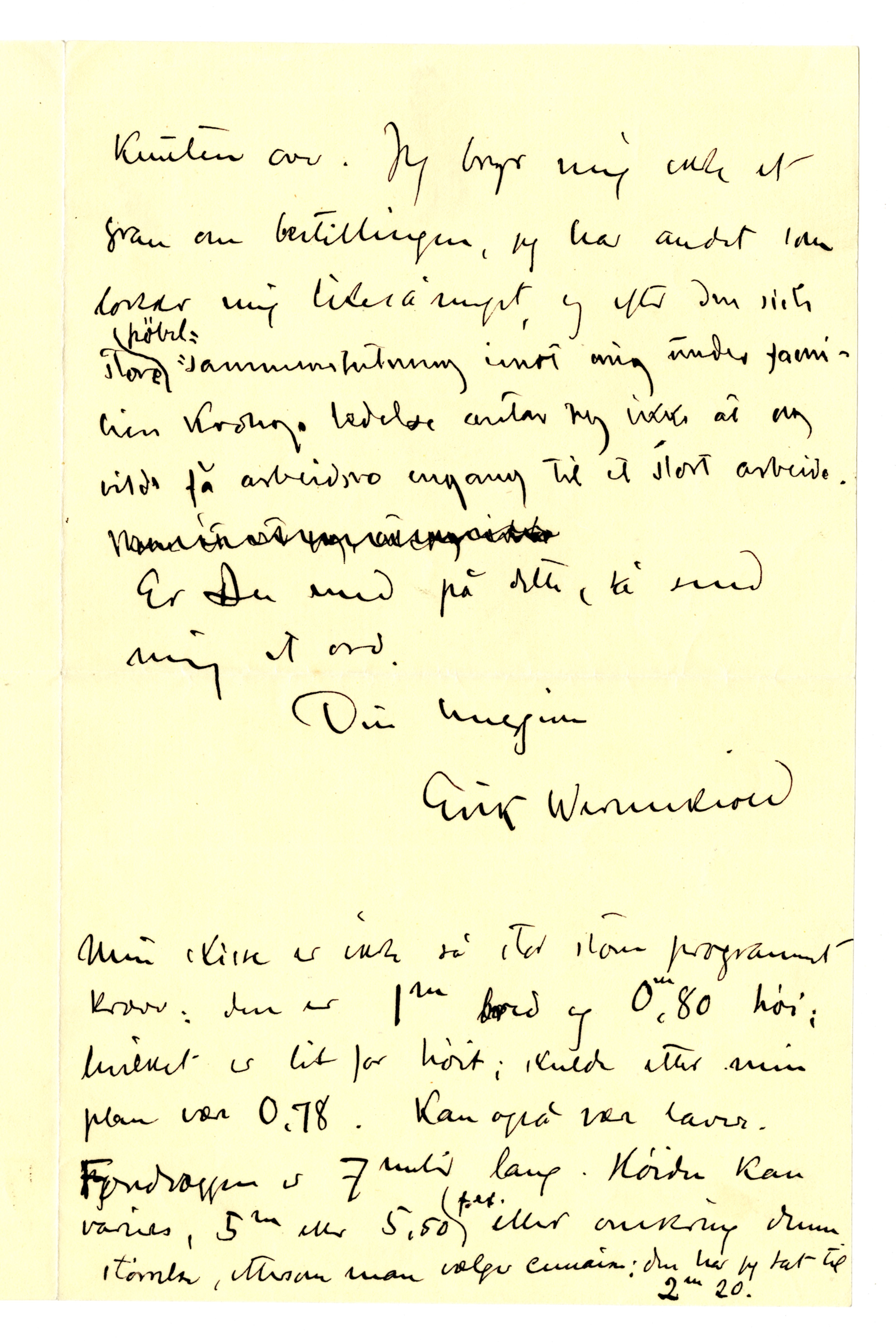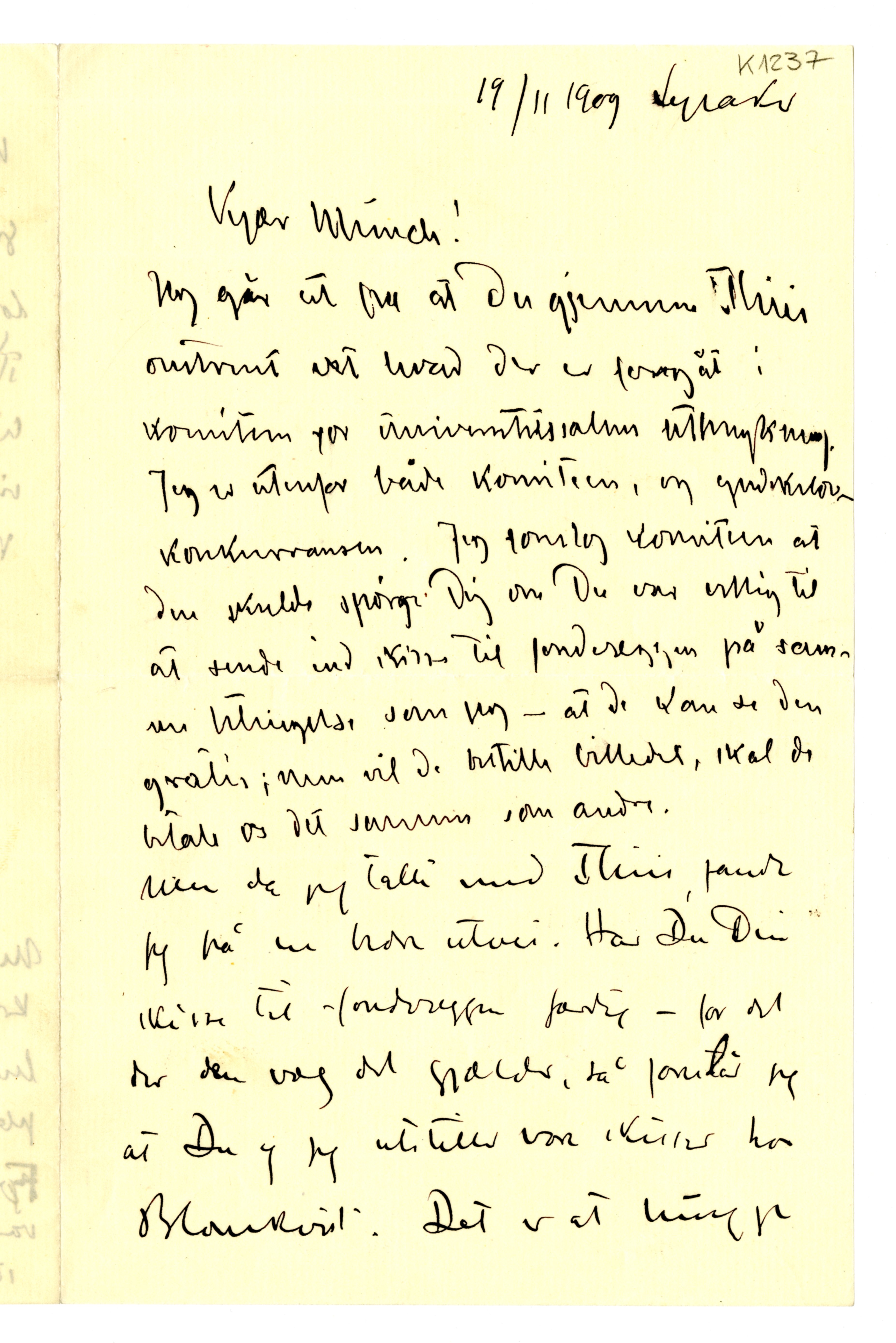 MM K 1237, Munchmuseet. Datert 19.11.1909. Brev fra Erik Werenskiold.