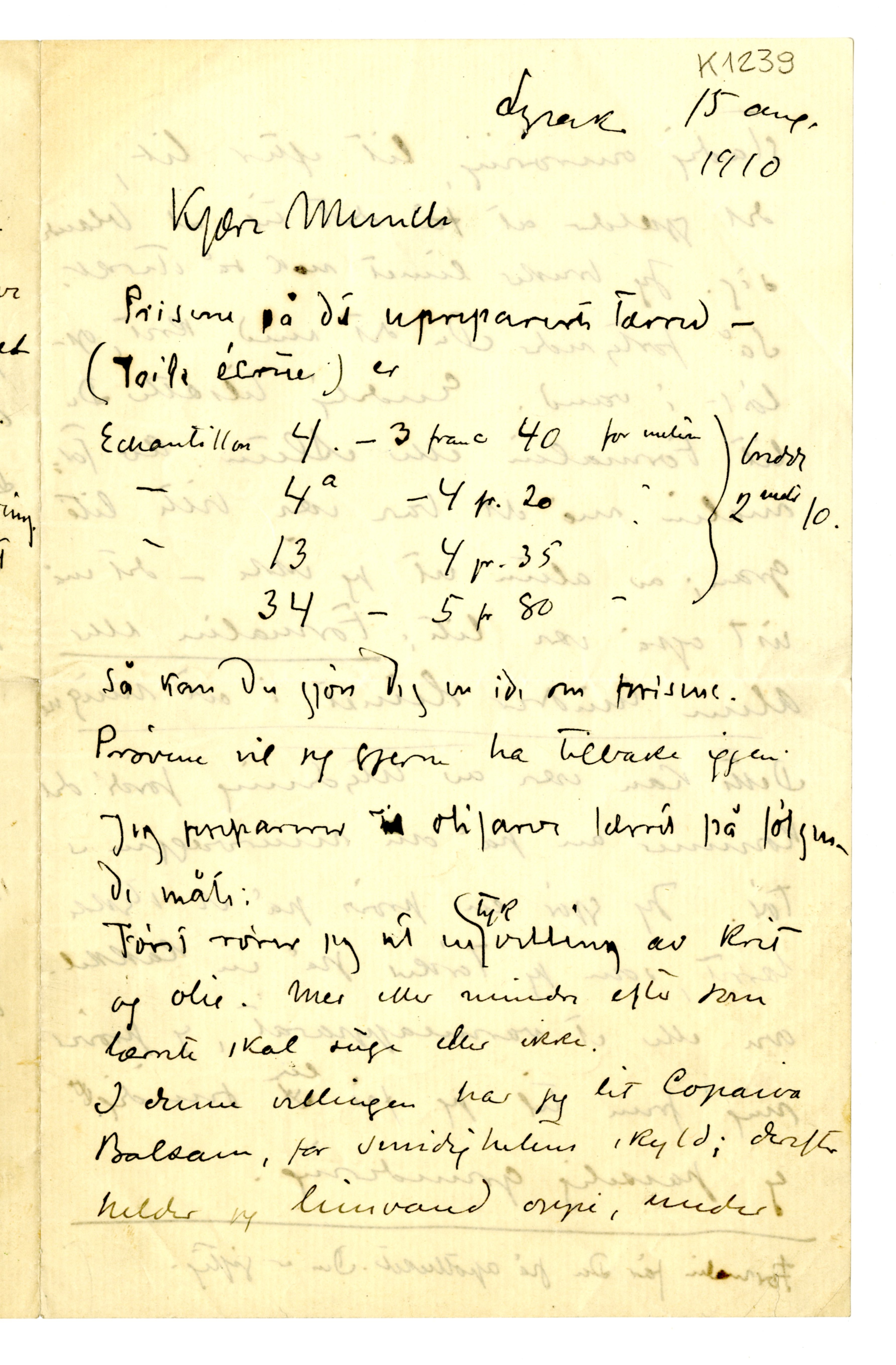 MM K 1239, Munchmuseet. Datert 15.08.1910. Brev fra Erik Werenskiold.