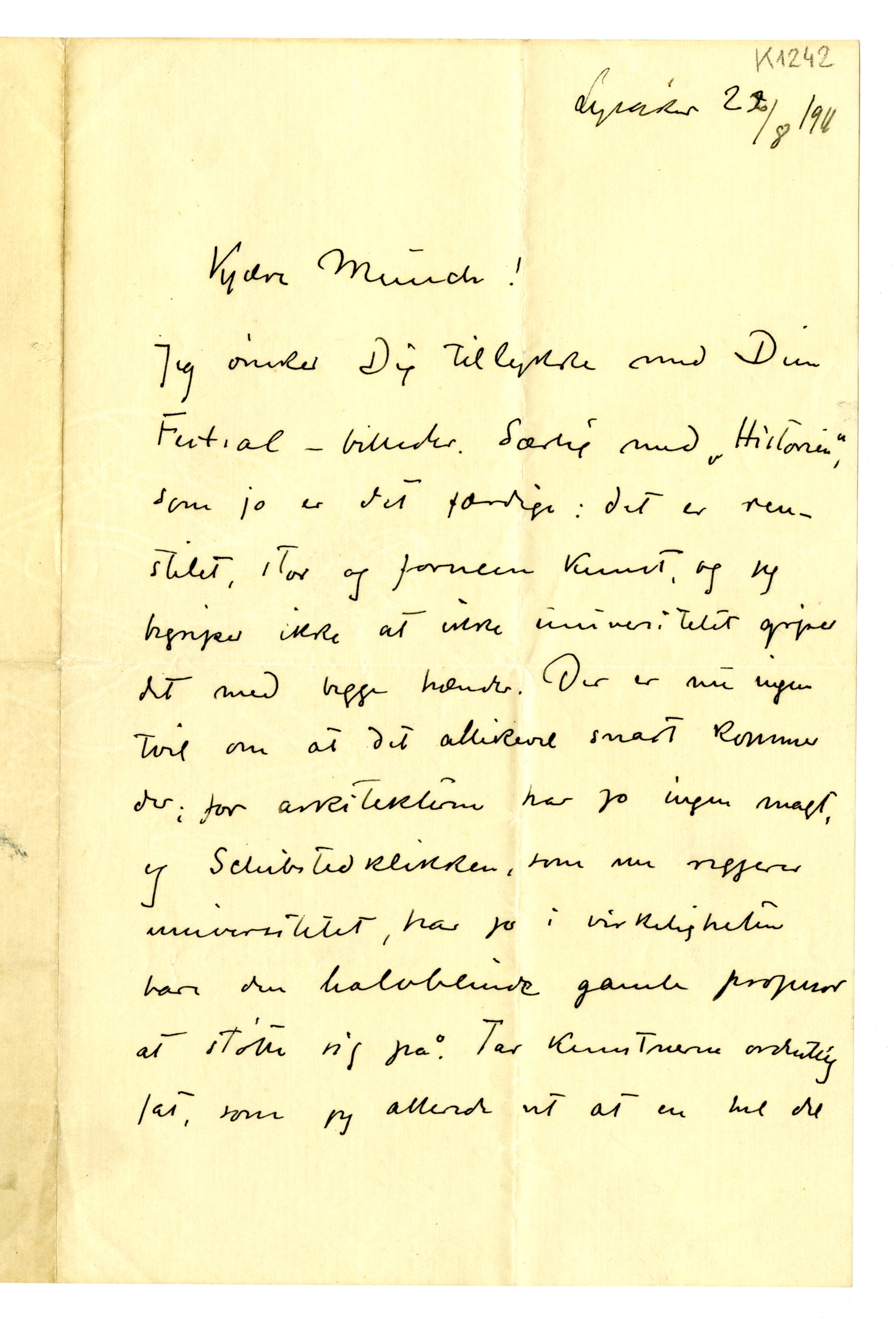 MM K 1242, Munchmuseet. Datert 27.08.1911. Brev fra Erik Werenskiold.