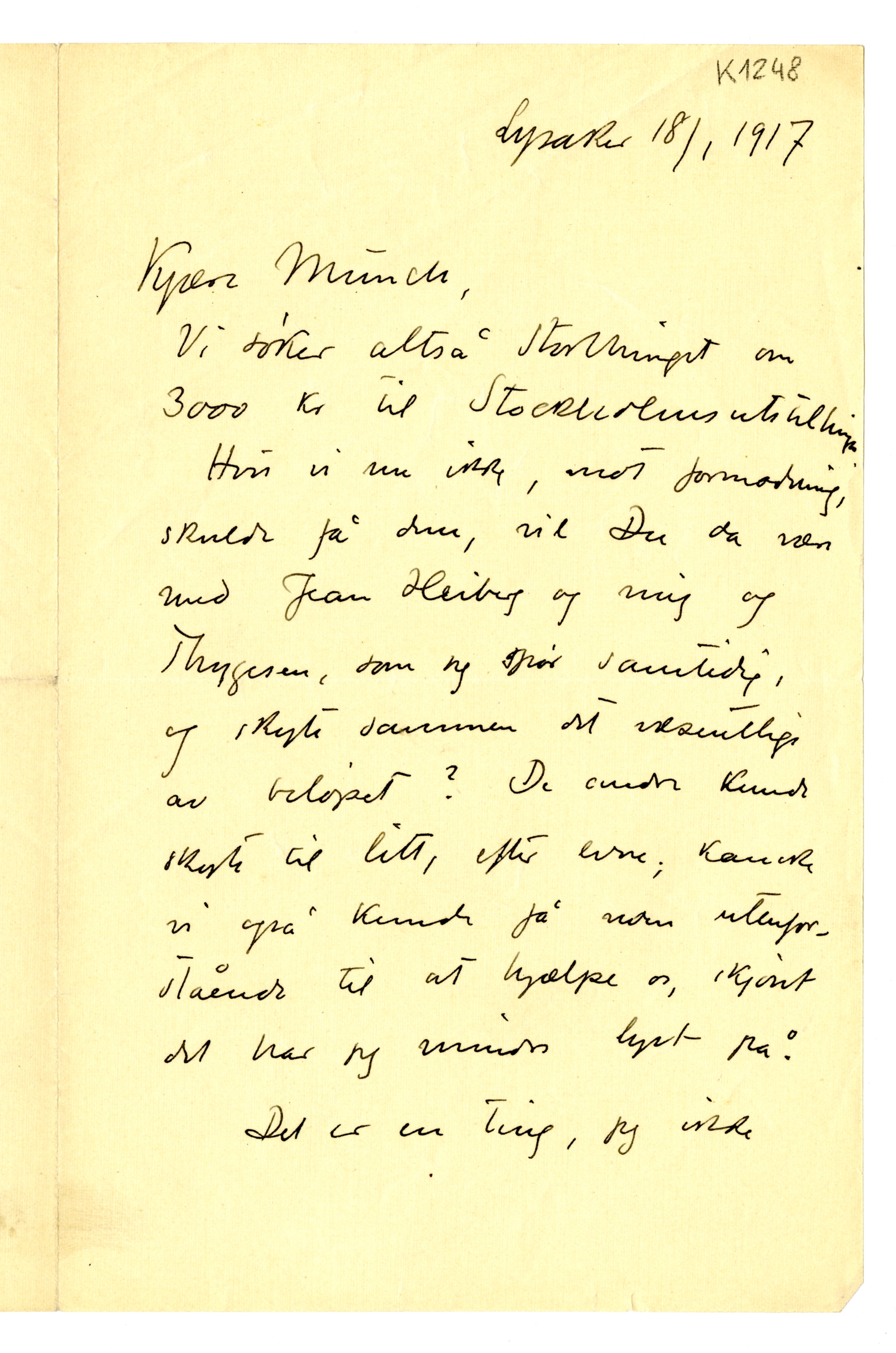 MM K 1248, Munchmuseet. Datert 18.01.1917. Brev fra Erik Werenskiold.