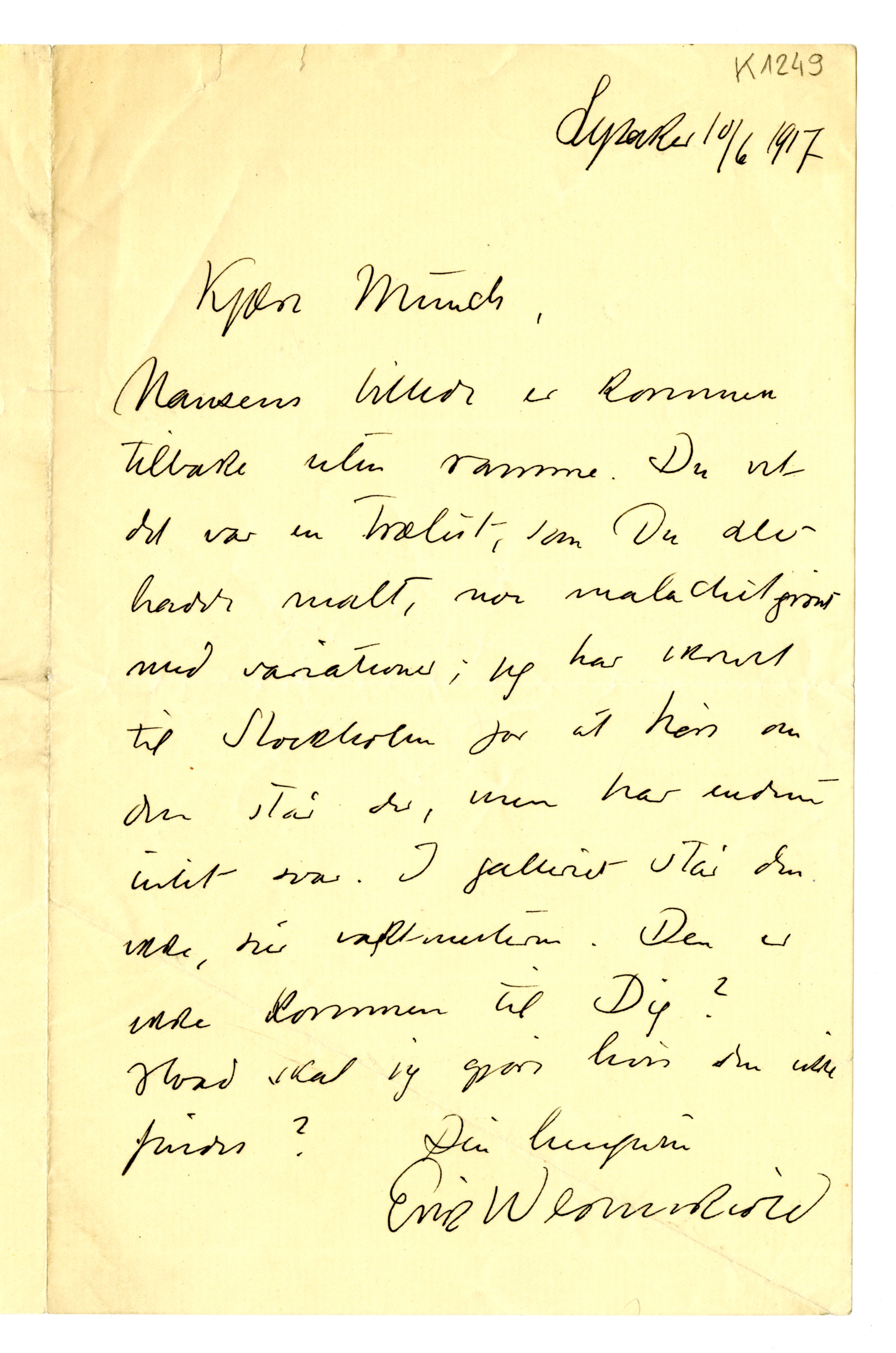 MM K 1249, Munchmuseet. Datert 10.06.1917. Brev fra Erik Werenskiold.