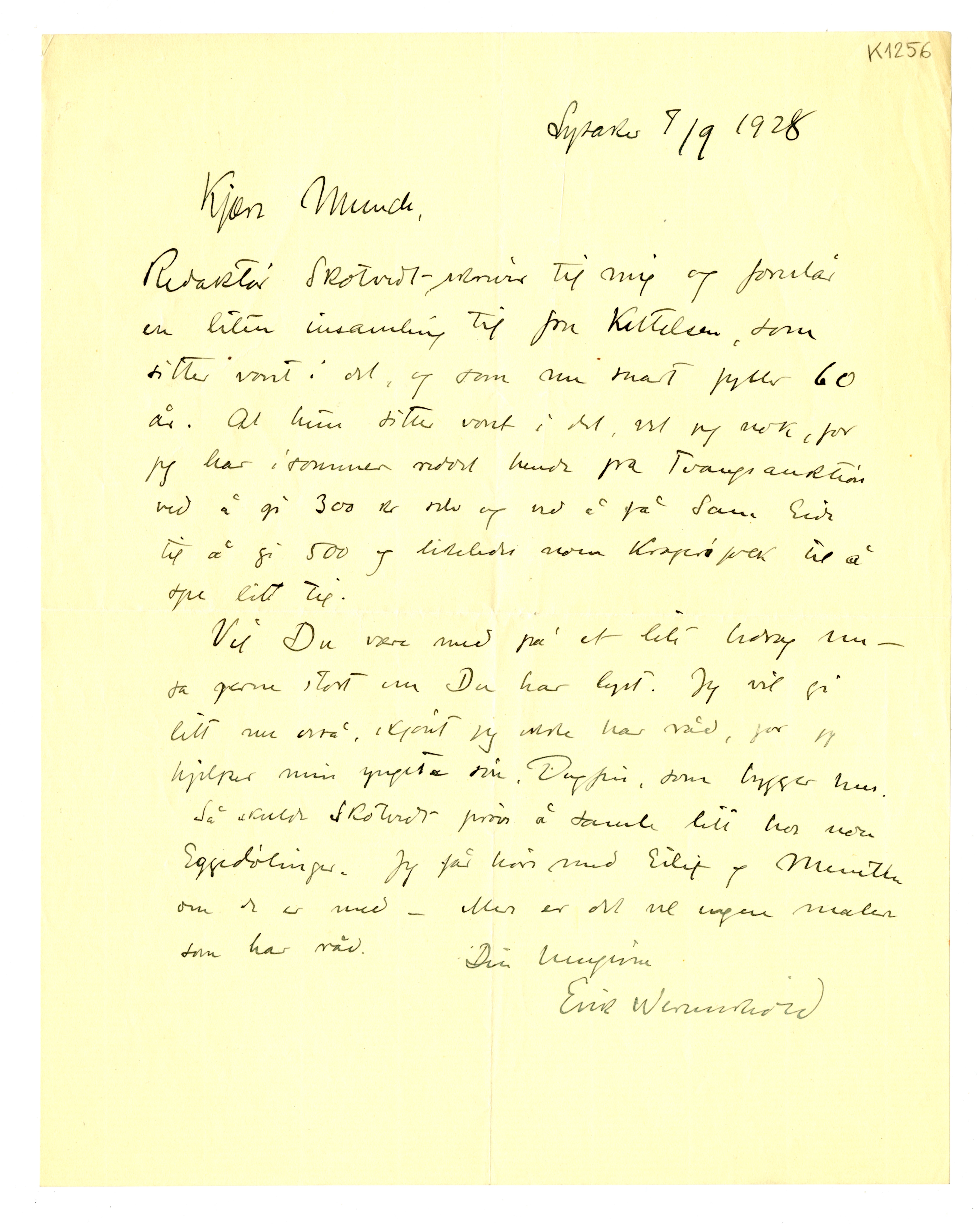 MM K 1256, Munchmuseet. Datert 07.09.1928. Brev fra Erik Werenskiold.