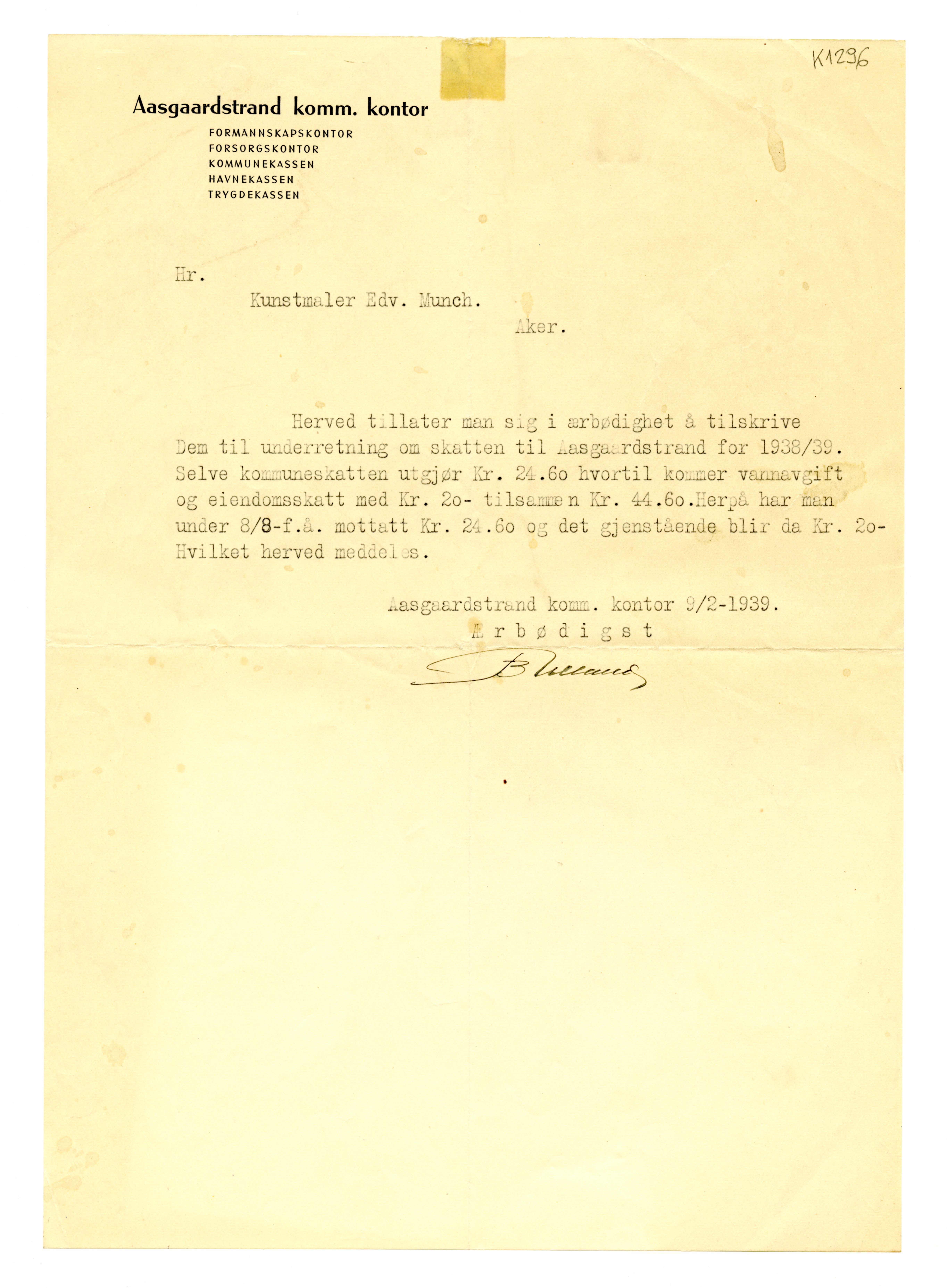 MM K 1296, Munchmuseet. Datert 09.02.1939. Brev fra Birger Ulland, Aasgaardstrand kommunale Kontor.