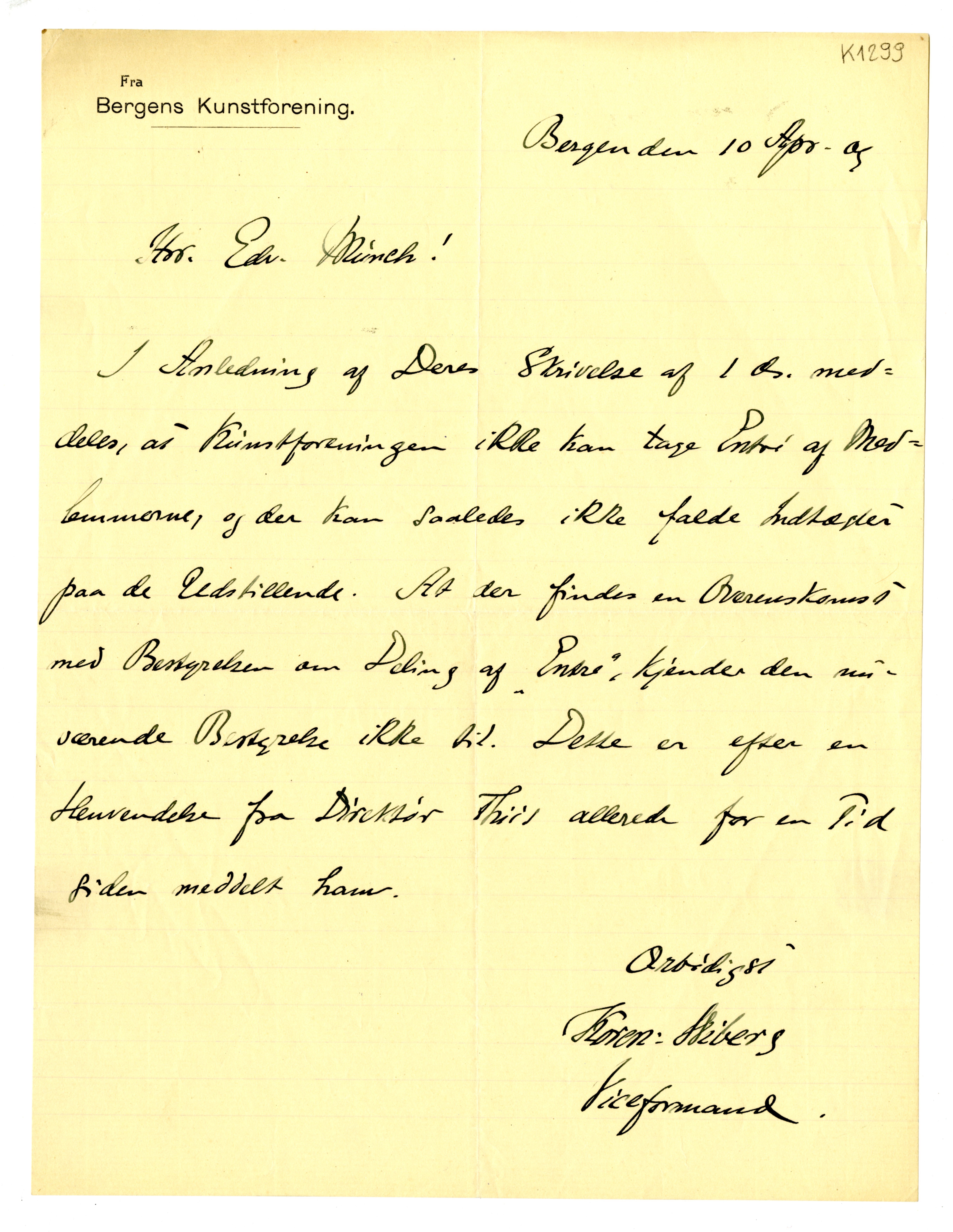 MM K 1299, Munchmuseet. Datert 10.04.1909. Brev fra Bergens Kunstforening.