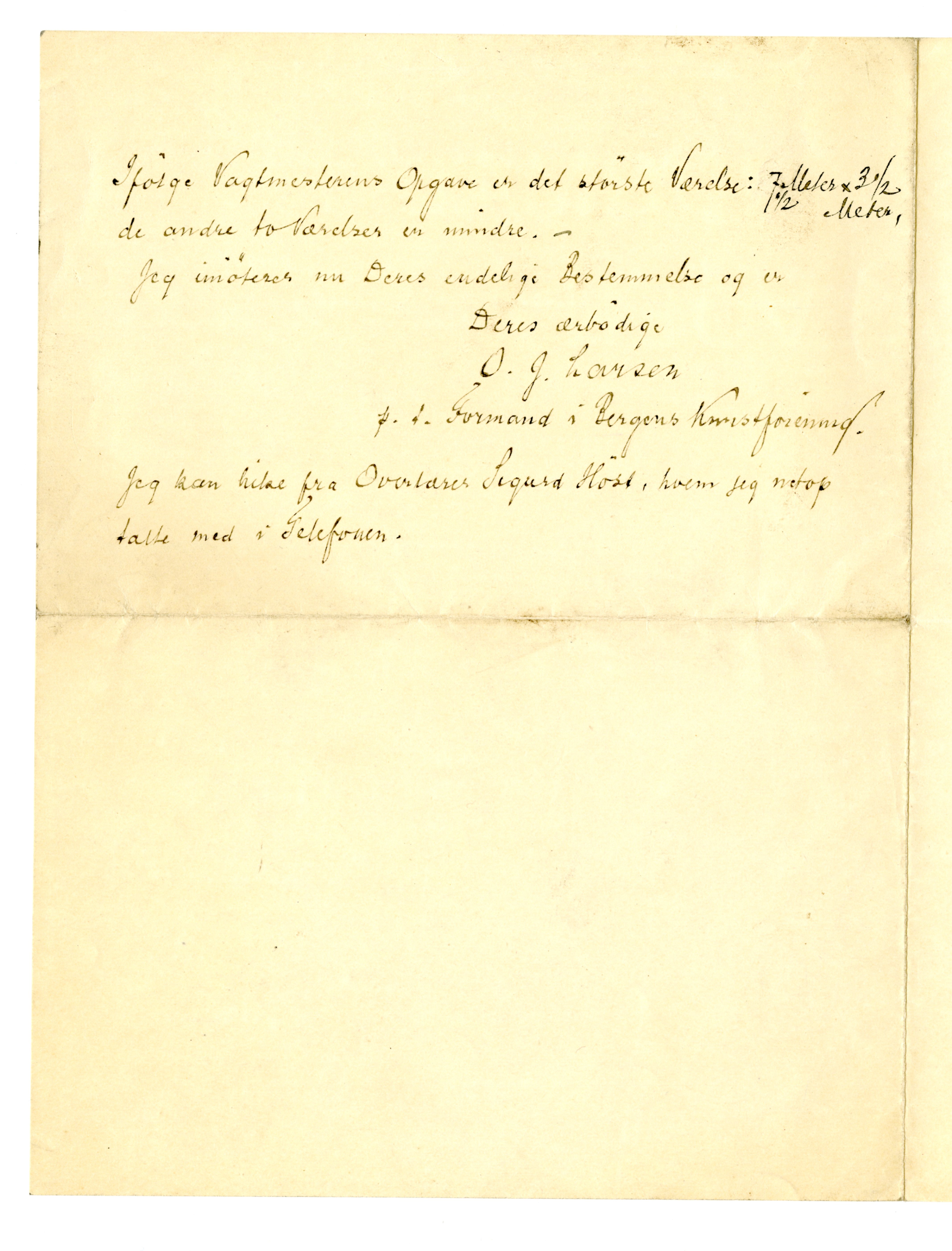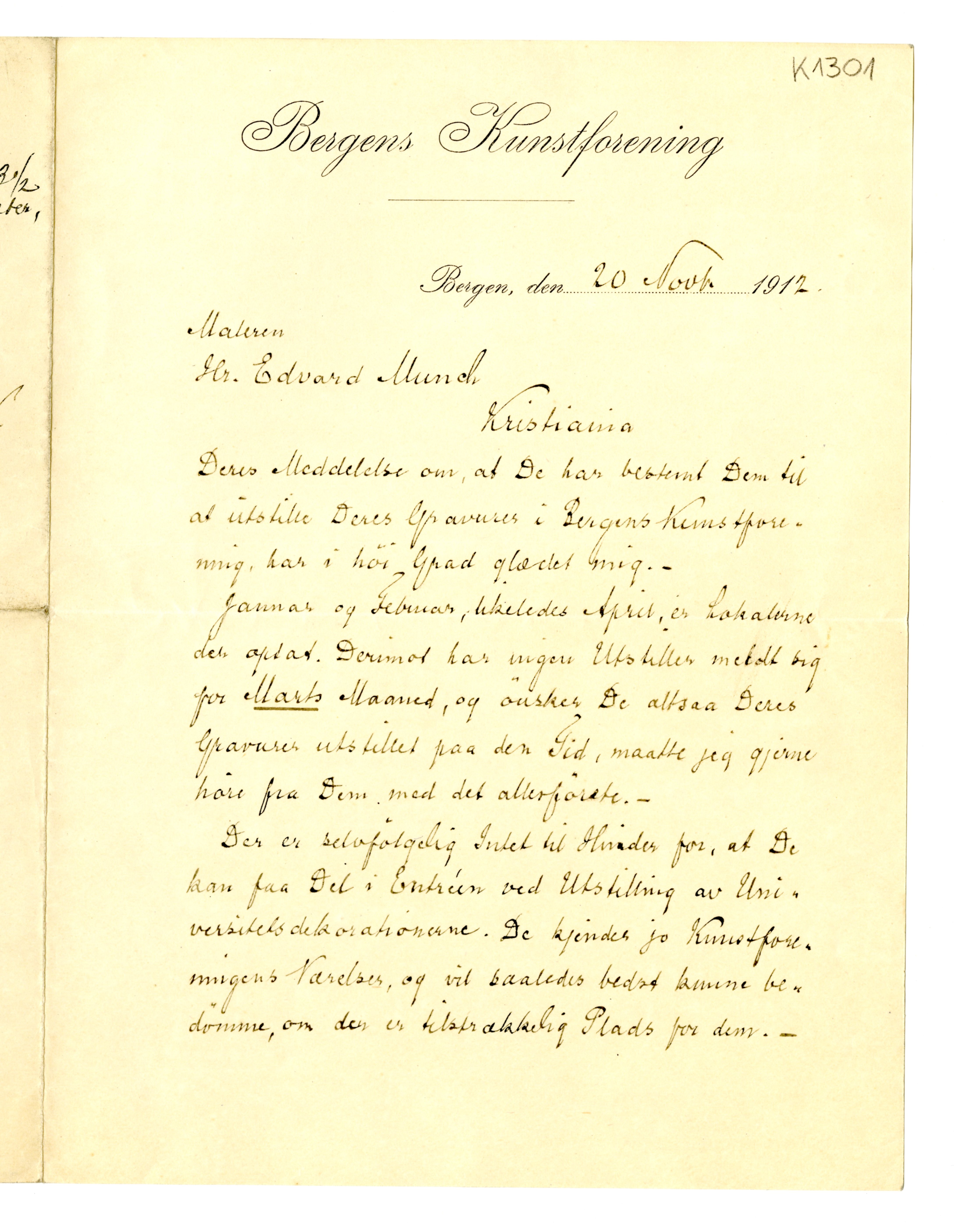 MM K 1301, Munchmuseet. Datert 20.11.1912. Brev fra O. J. Larsen, Bergens Kunstforening.