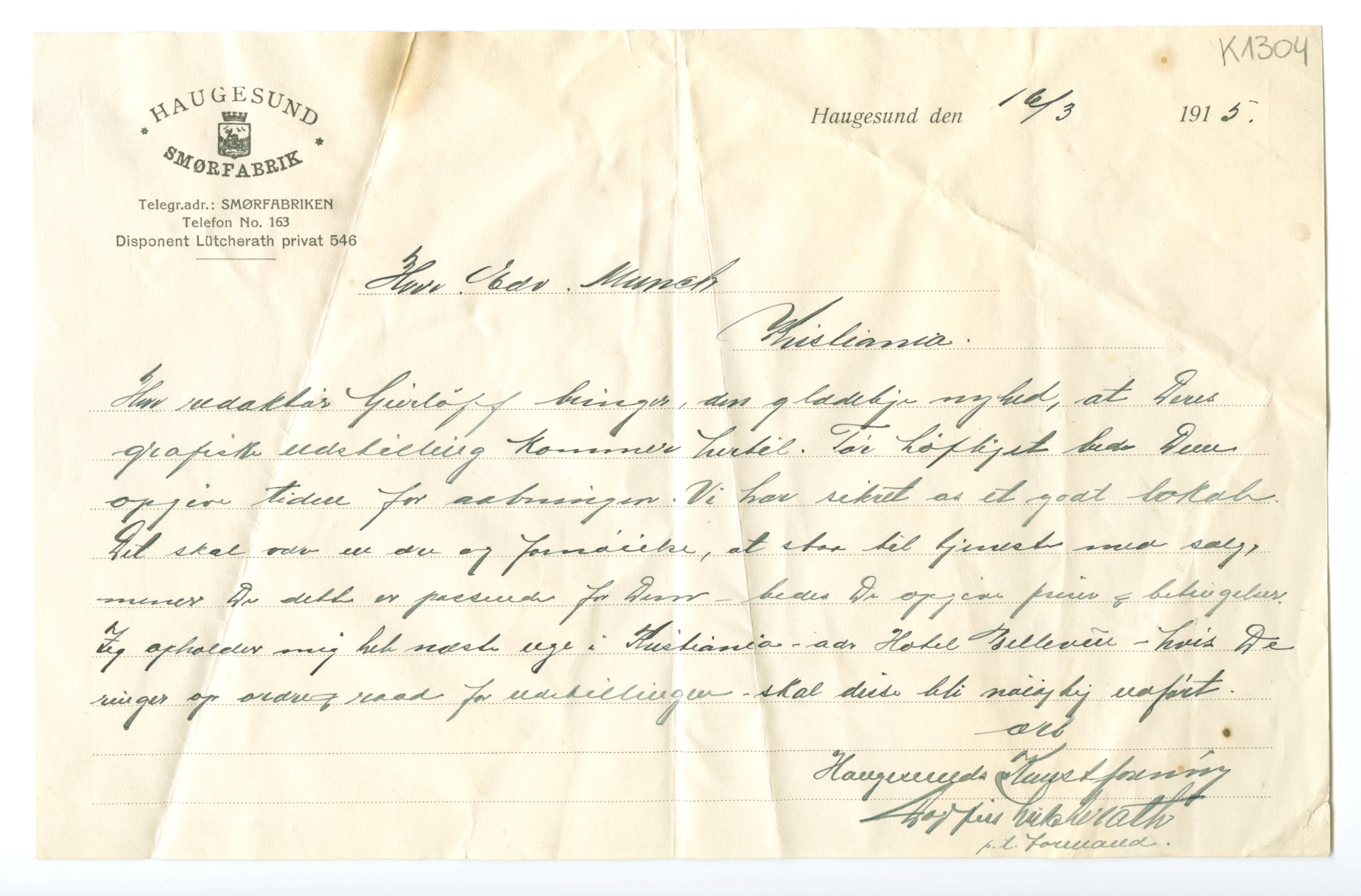 MM K 1304, Munchmuseet. Datert 16.03.1915. Brev fra Dagfin Lütcherath, Haugesund Kunstforening.