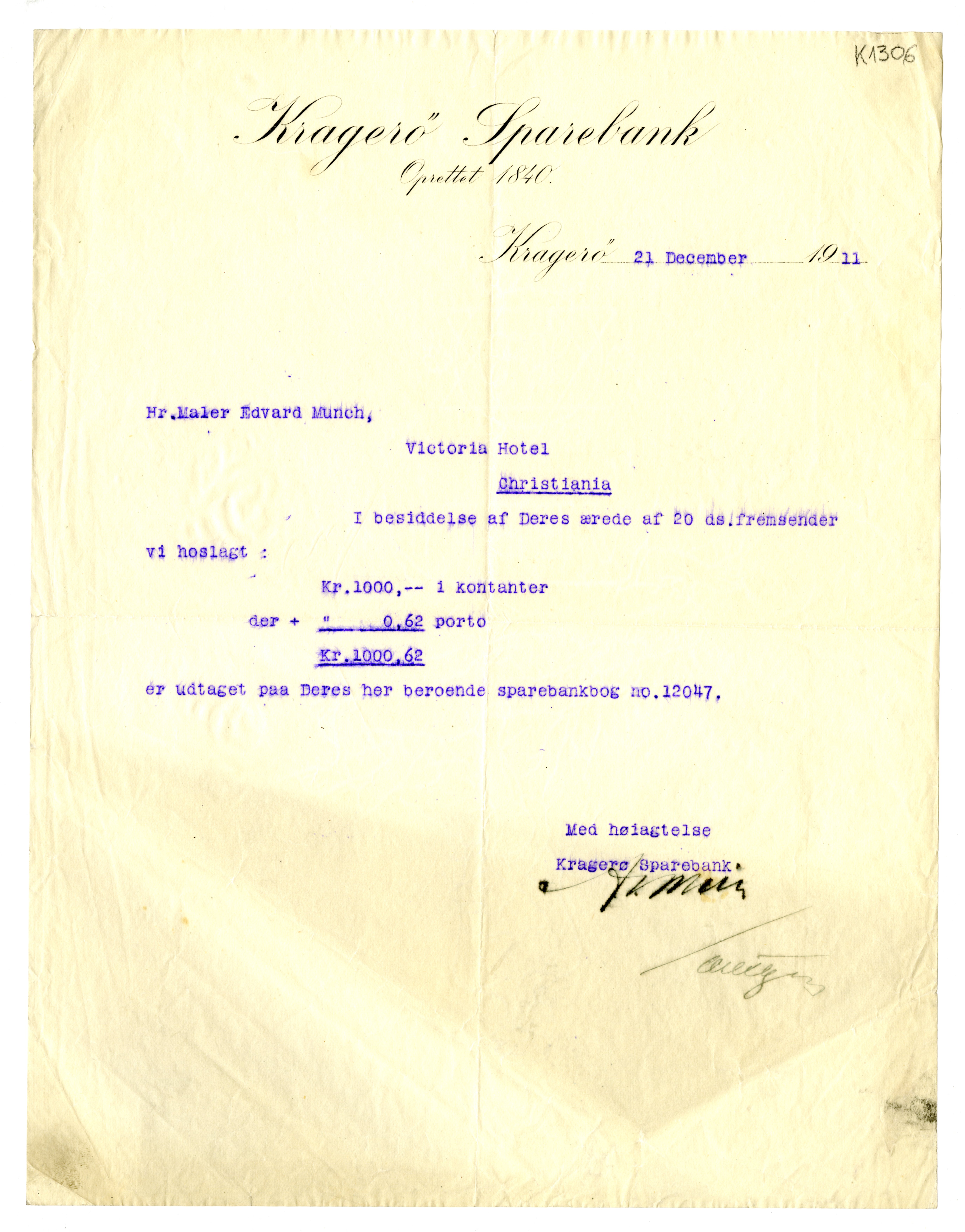 MM K 1306, Munchmuseet. Datert 21.12.1911. Brev fra Kragerø Sparebank.