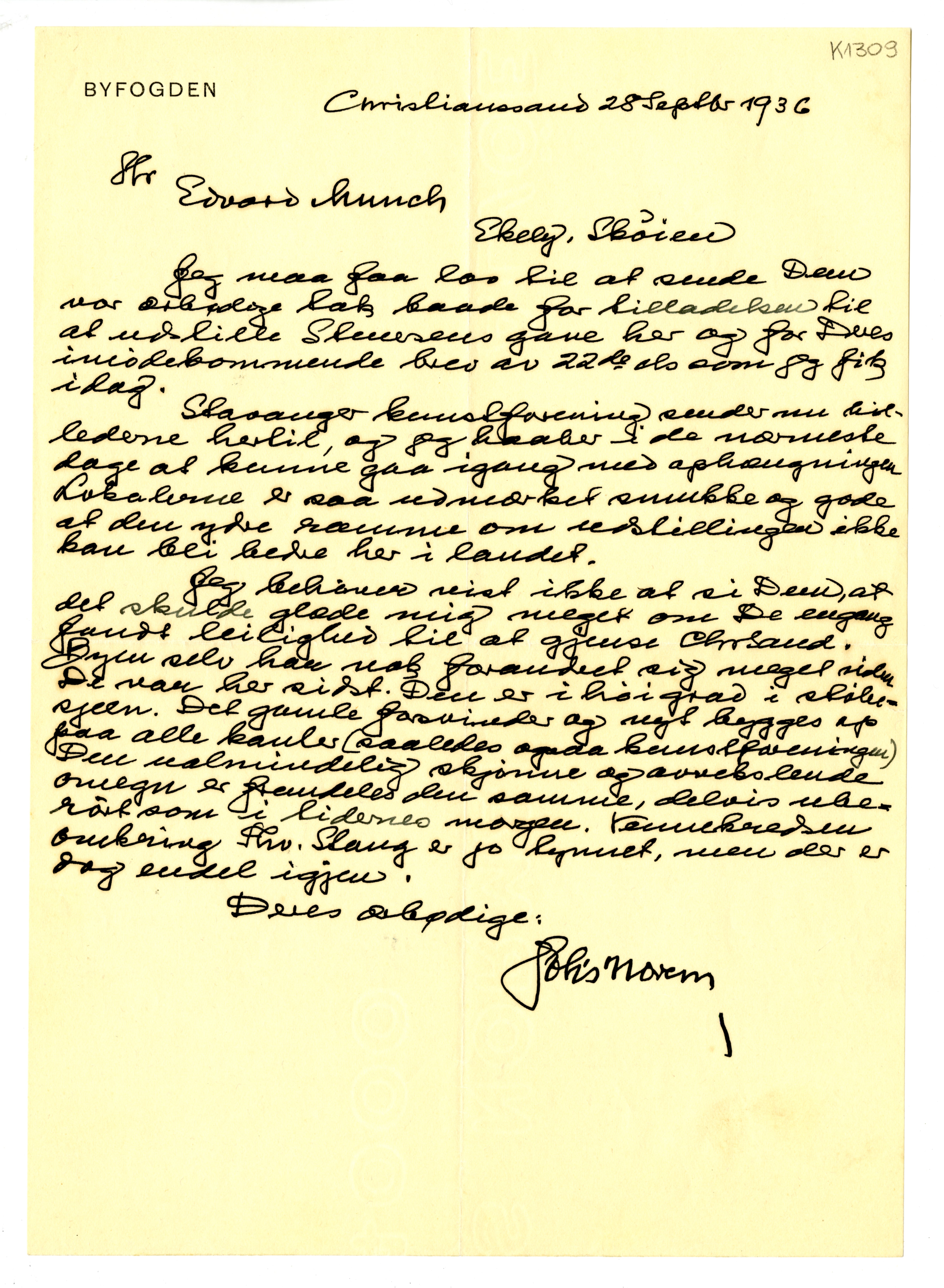 MM K 1309, Munchmuseet. Datert 28.09.1936. Brev fra Christianssands Kunstforening, Johs Norem.
