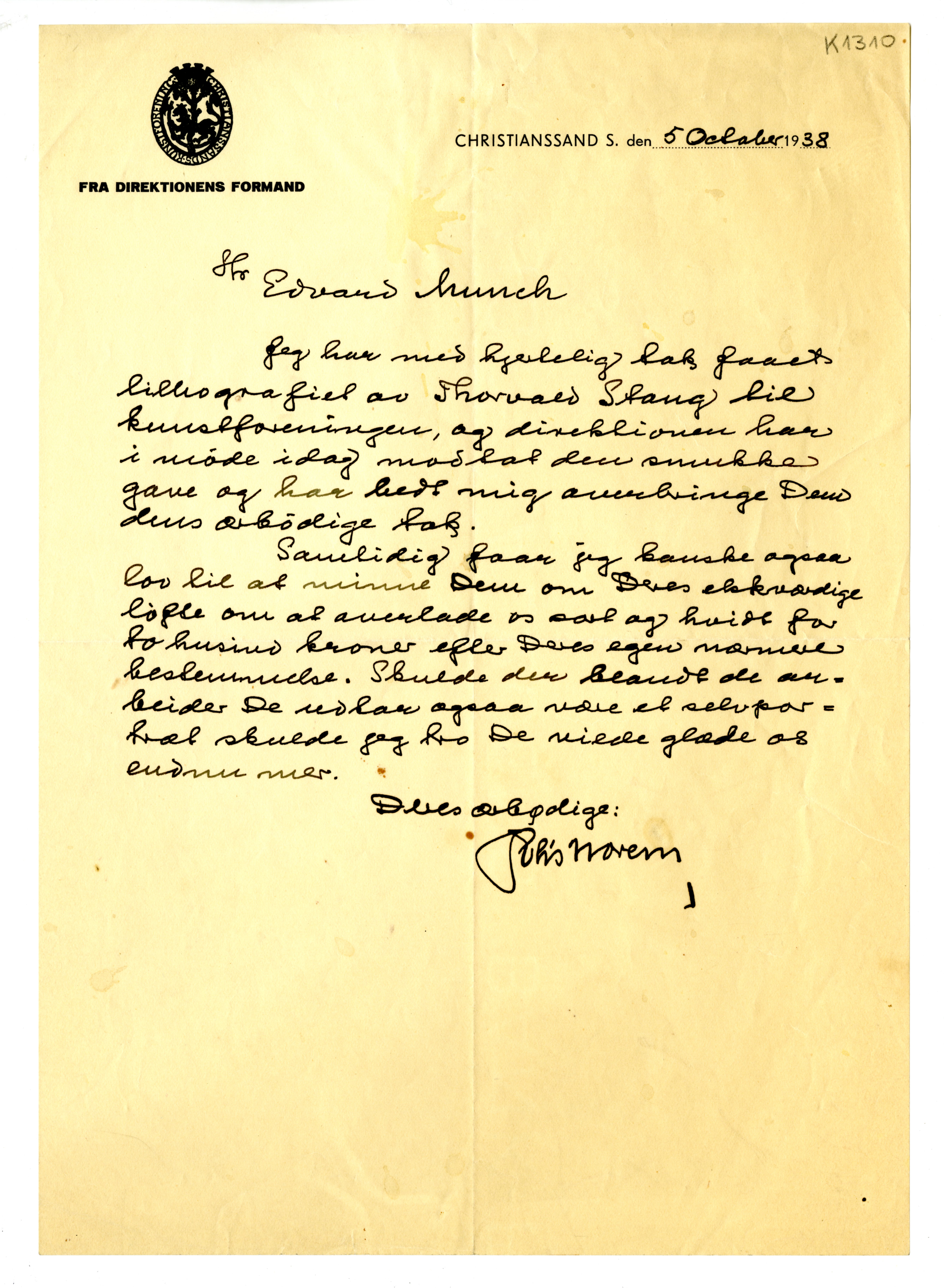 MM K 1310, Munchmuseet. Datert 05.10.1938. Brev fra Christianssands Kunstforening, Johs Norem.