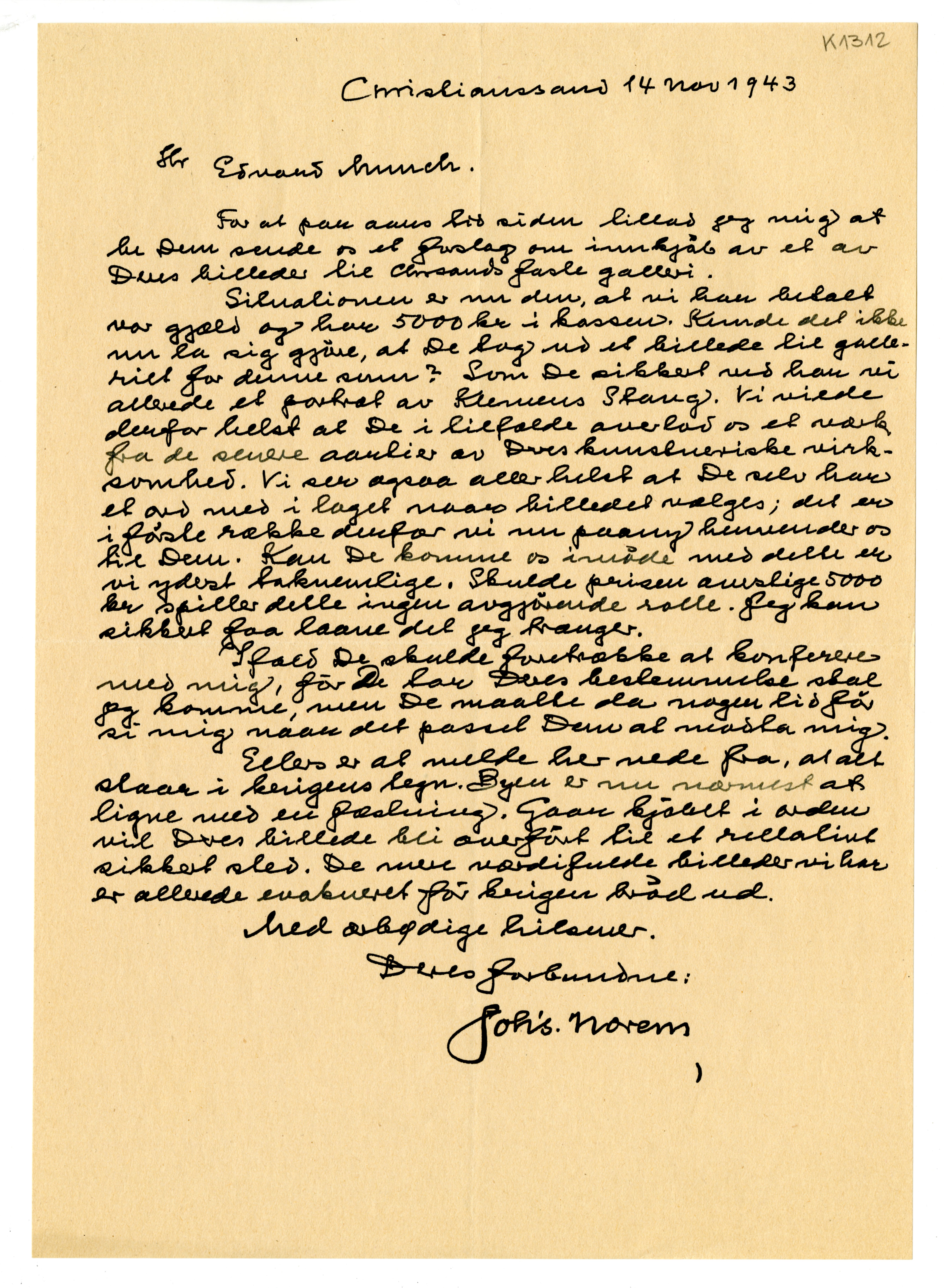 MM K 1312, Munchmuseet. Datert 14.11.1943. Brev fra Christianssands Kunstforening, Johs Norem.