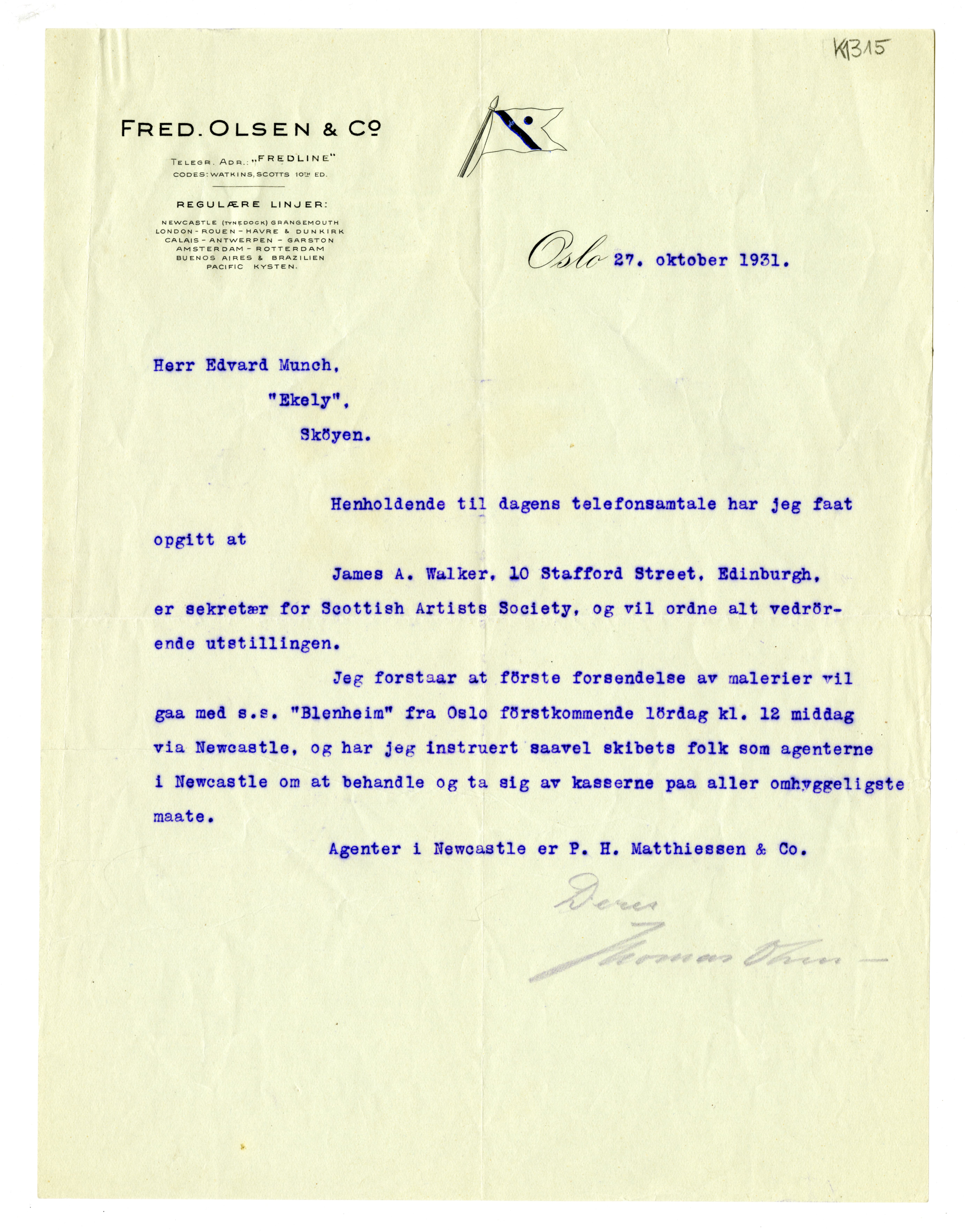 MM K 1315, Munchmuseet. Datert 27.10.1931. Brev fra Thomas Olsen, Fred Olsen & Co.