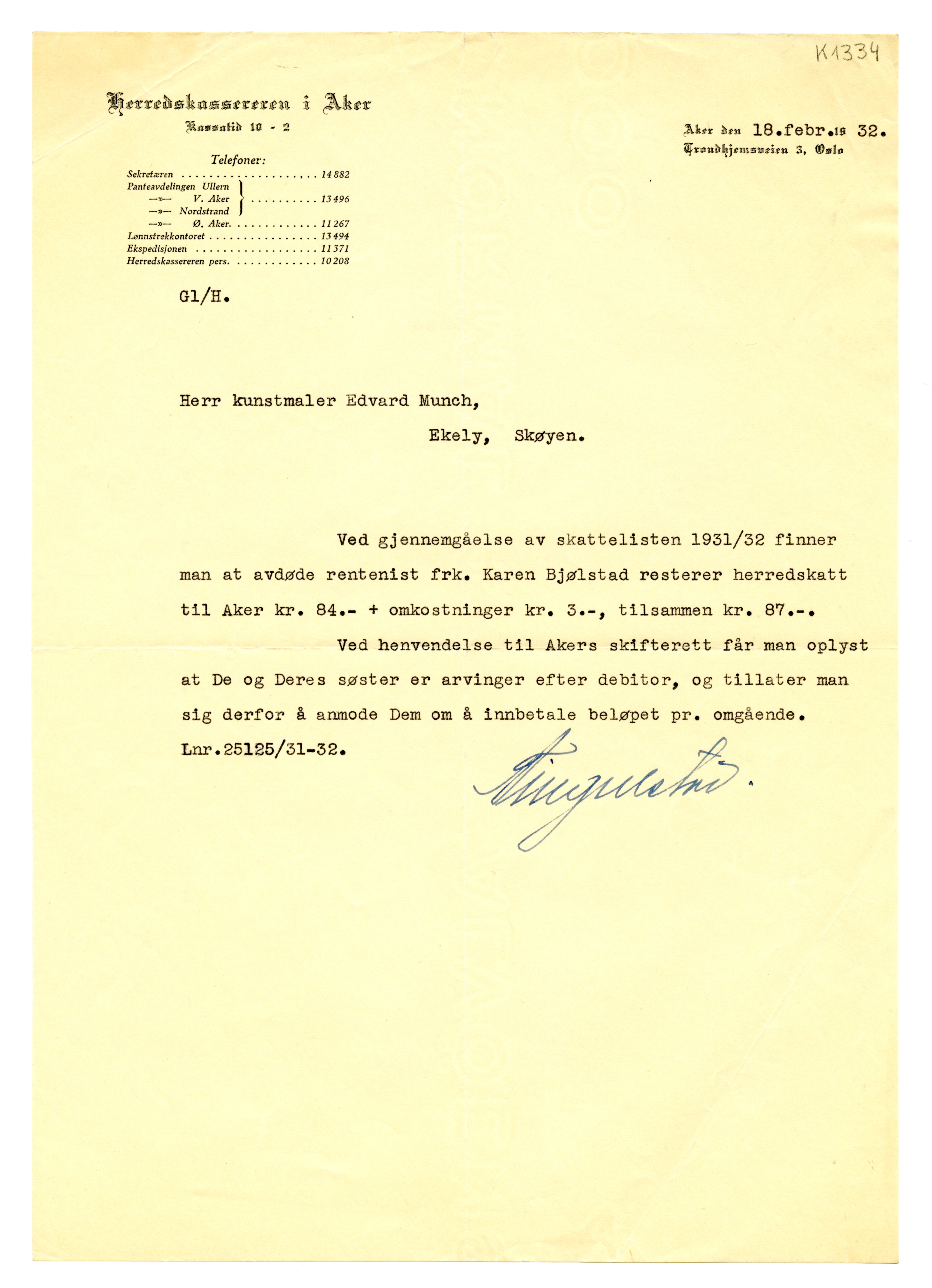MM K 1334, Munchmuseet. Datert 18.02.1932. Brev fra Akers Ligningsvæsen.