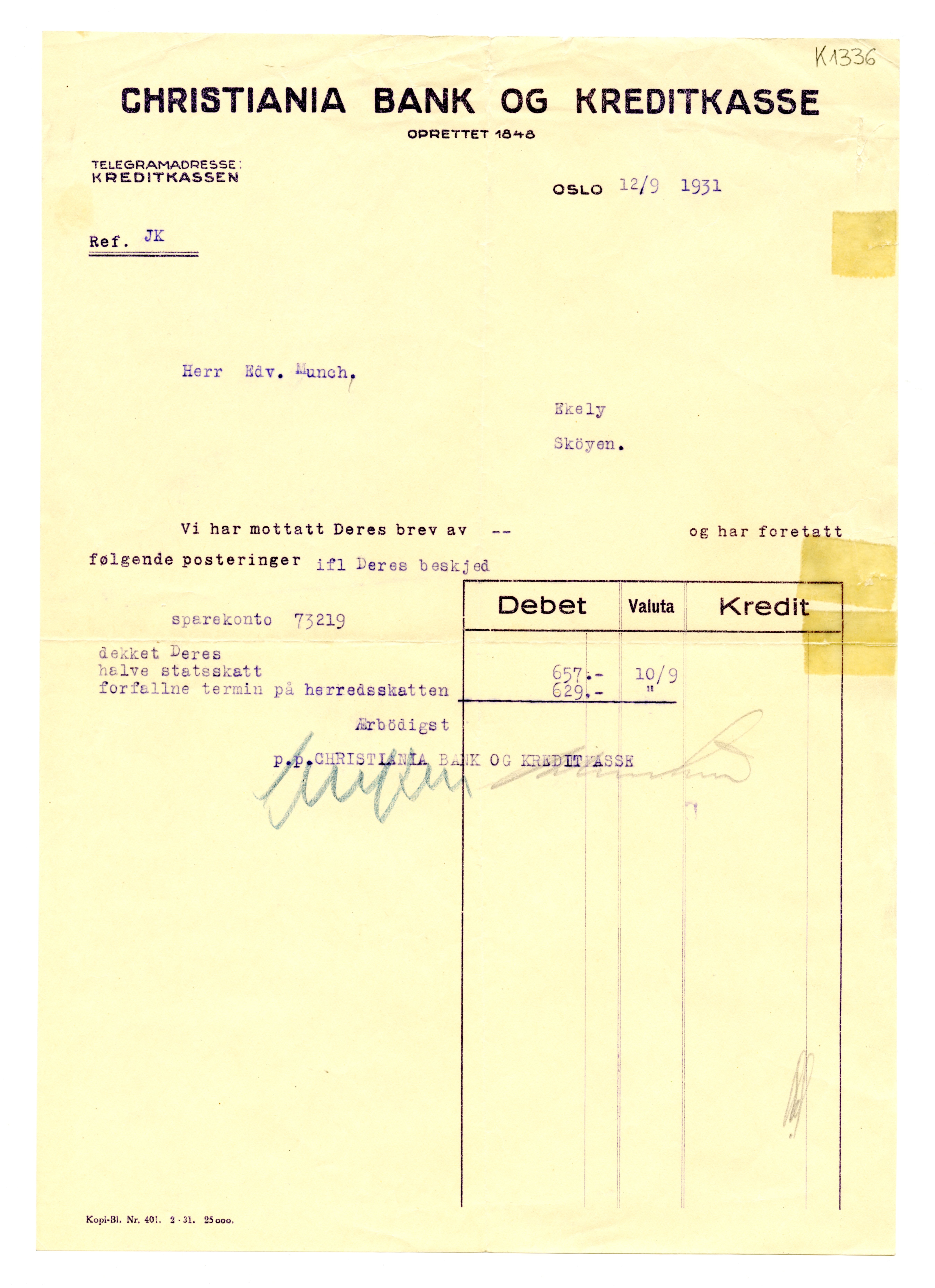 MM K 1336, Munchmuseet. Datert 12.09.1931. Brev fra Christiania Bank og Kreditkasse.