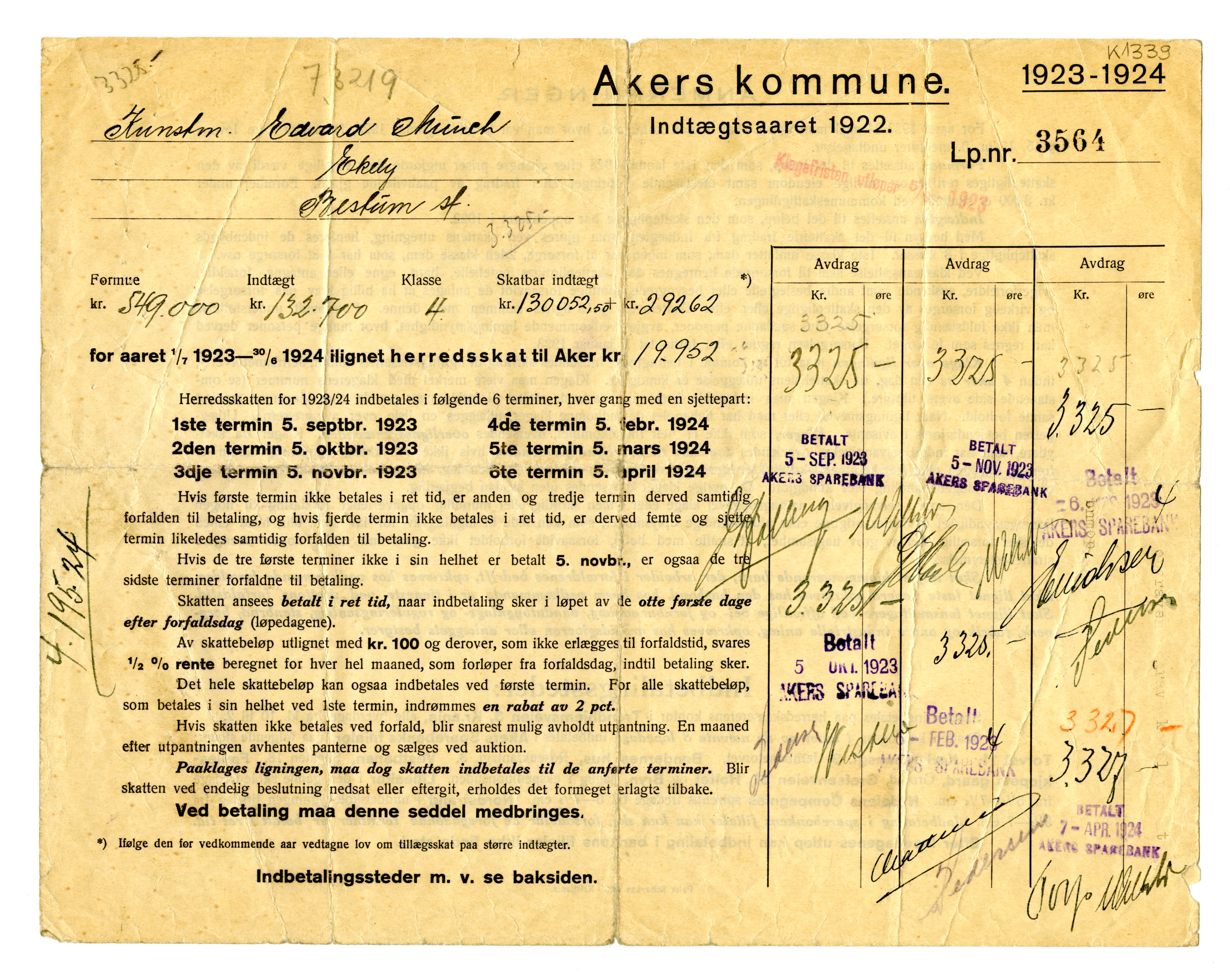 MM K 1339, Munchmuseet. Datert 05.09.1923. Brev fra Akers Ligningsvæsen.