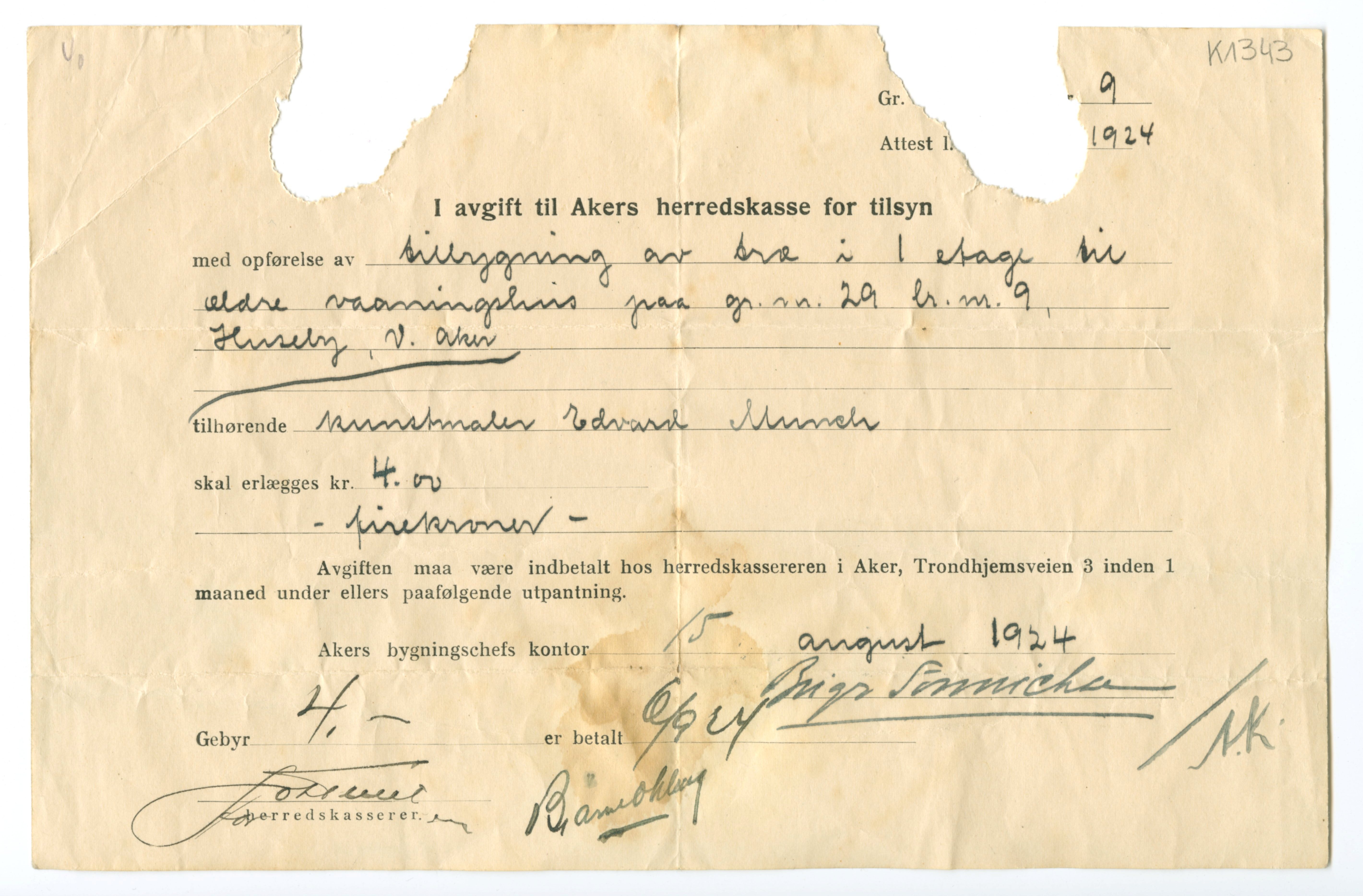 MM K 1343, Munchmuseet. Datert 15.08.1924. Brev fra Akers herredskasse.
