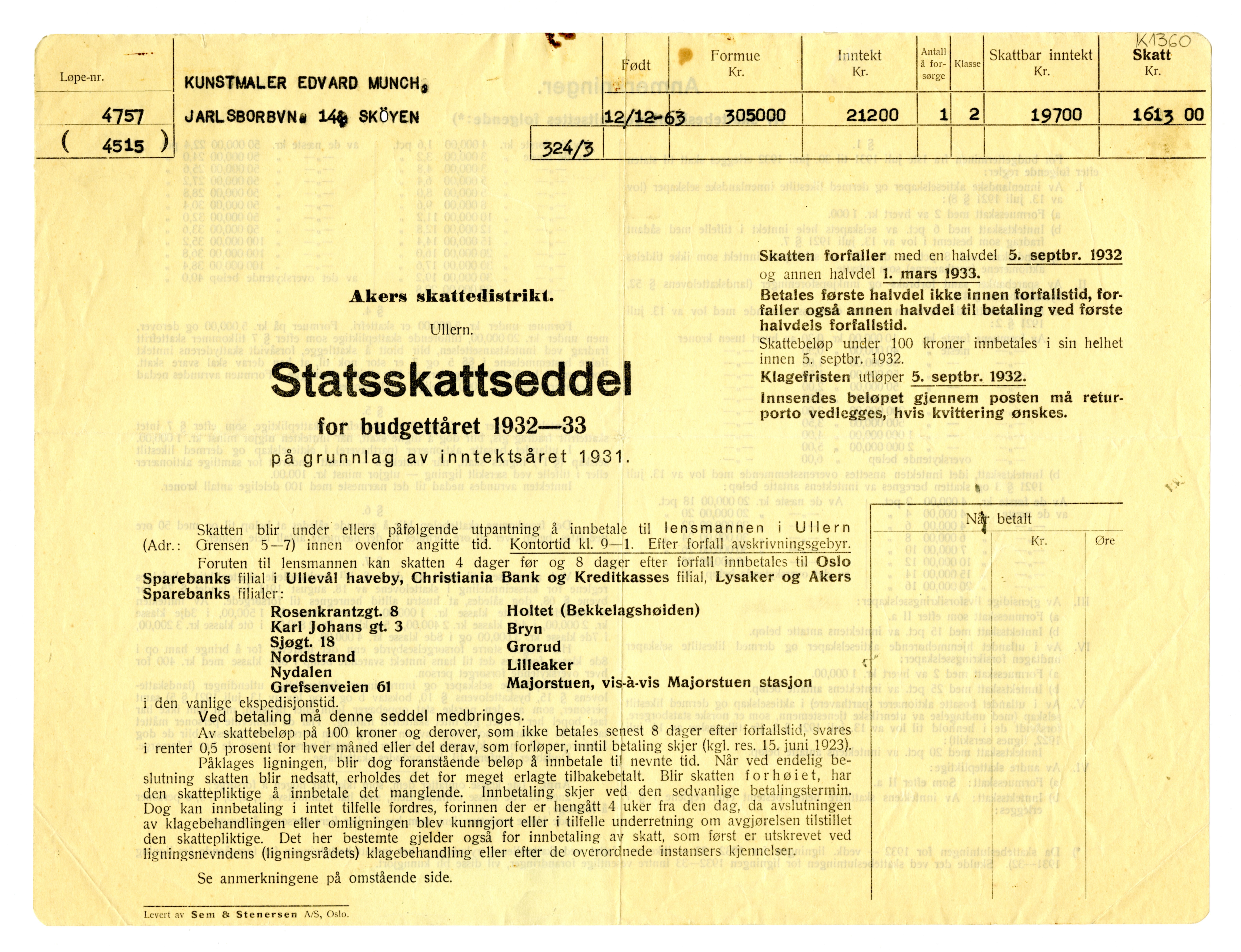 MM K 1360, Munchmuseet. Ikke datert. Brev fra Akers skattedistrikt.