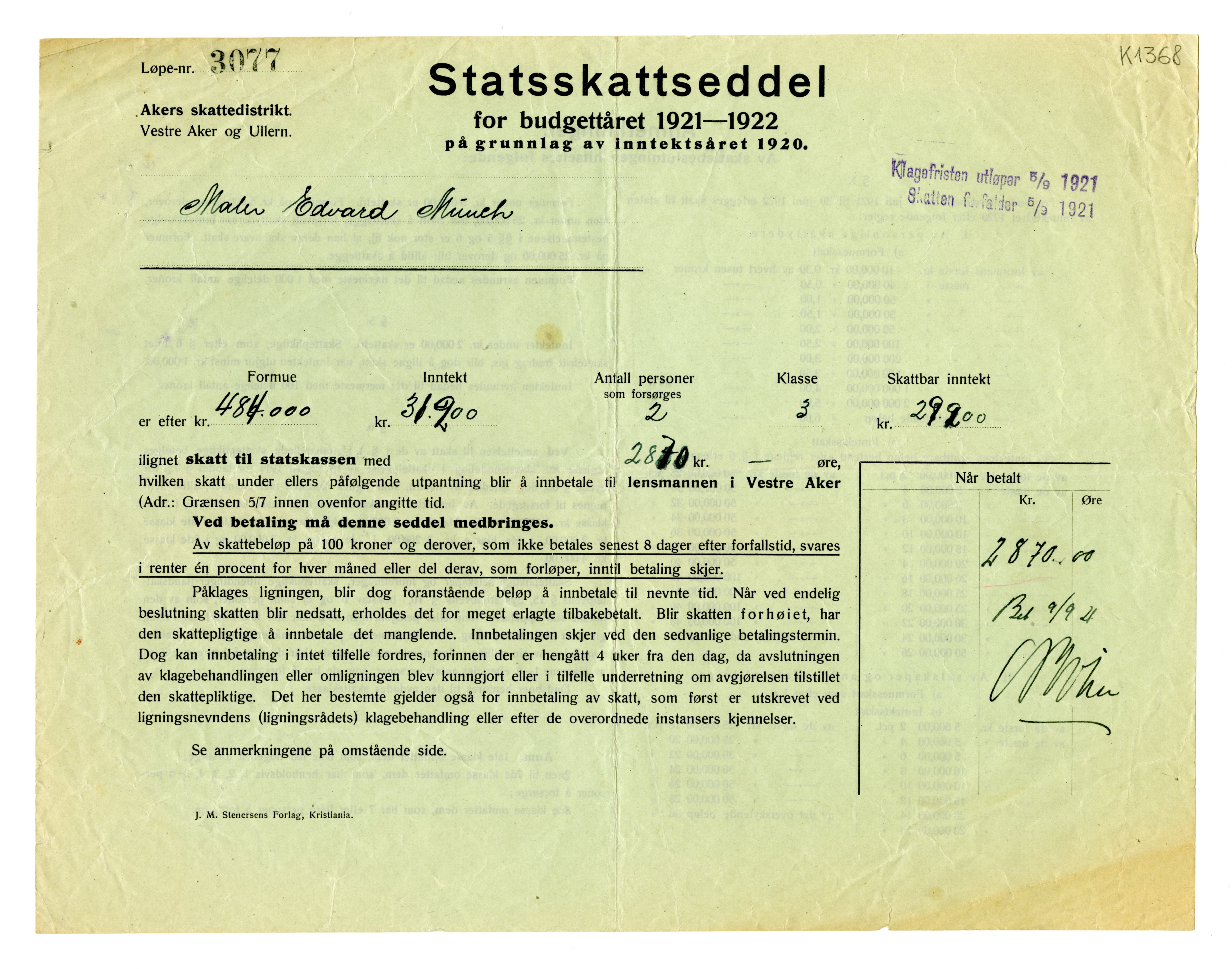 MM K 1368, Munchmuseet. Datert 09.09.1921. Brev fra Akers skattedistrikt.