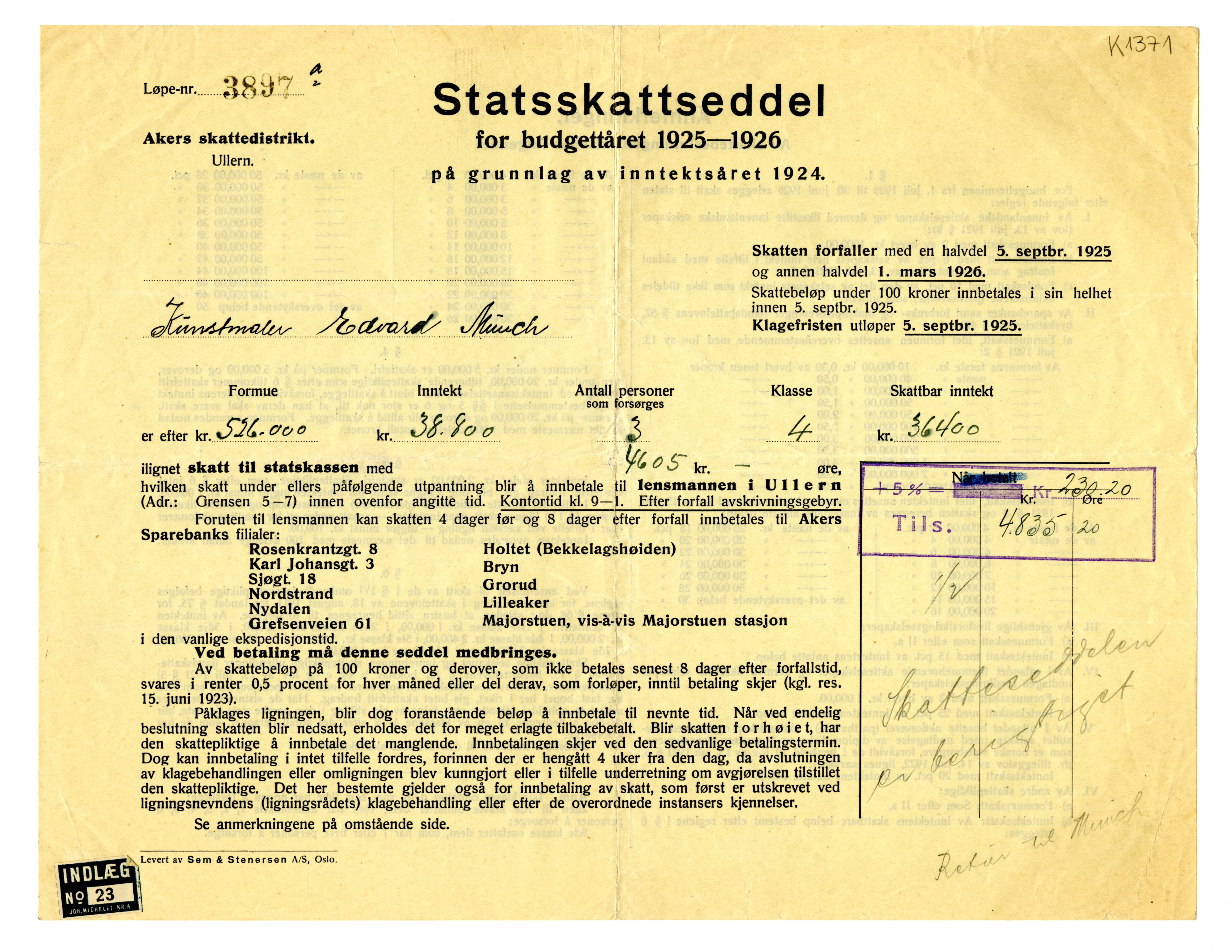 MM K 1371, Munchmuseet. Ikke datert. Brev fra Akers skattedistrikt.
