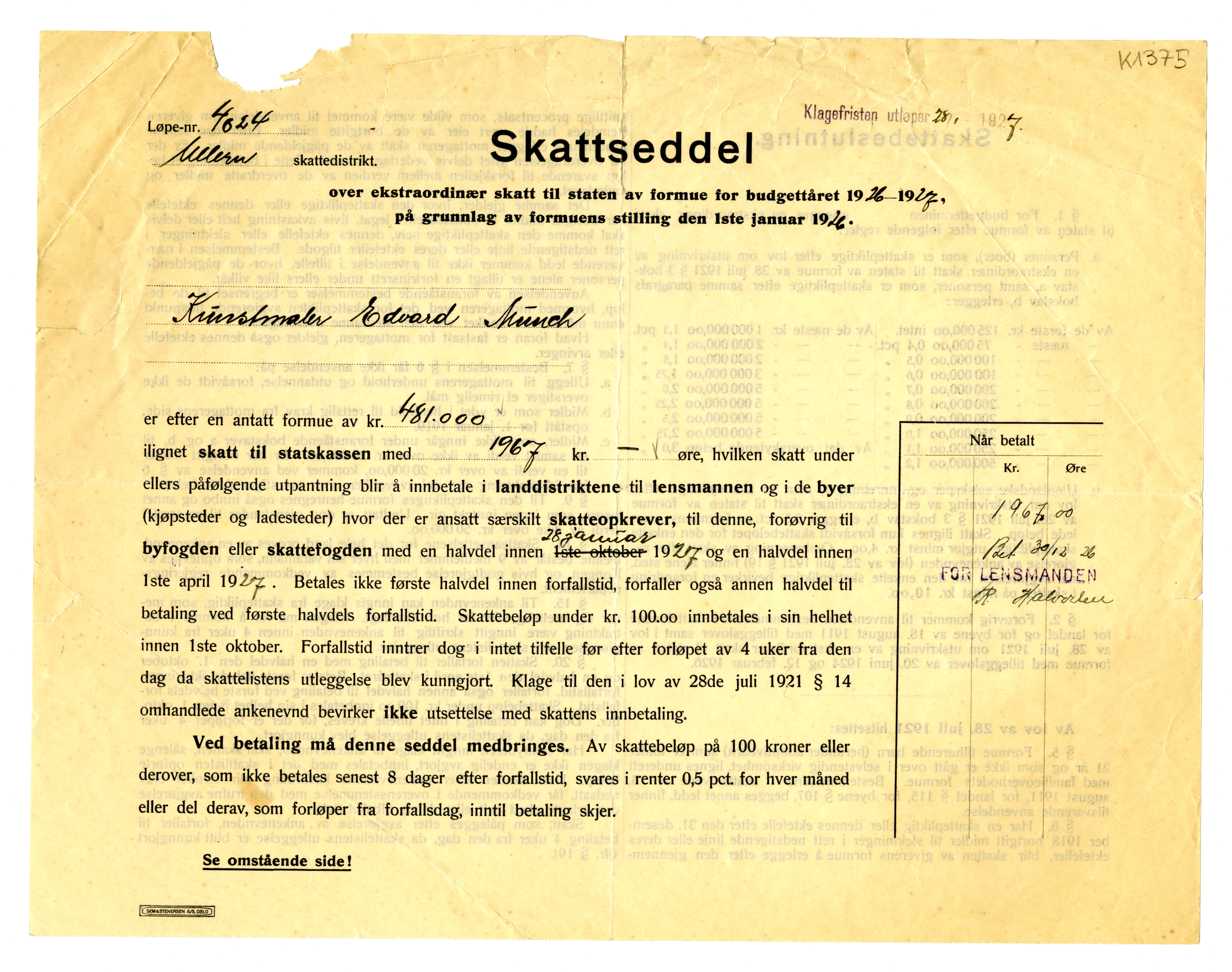MM K 1375, Munchmuseet. Datert 30.12.1926. Brev fra Akers skattedistrikt.