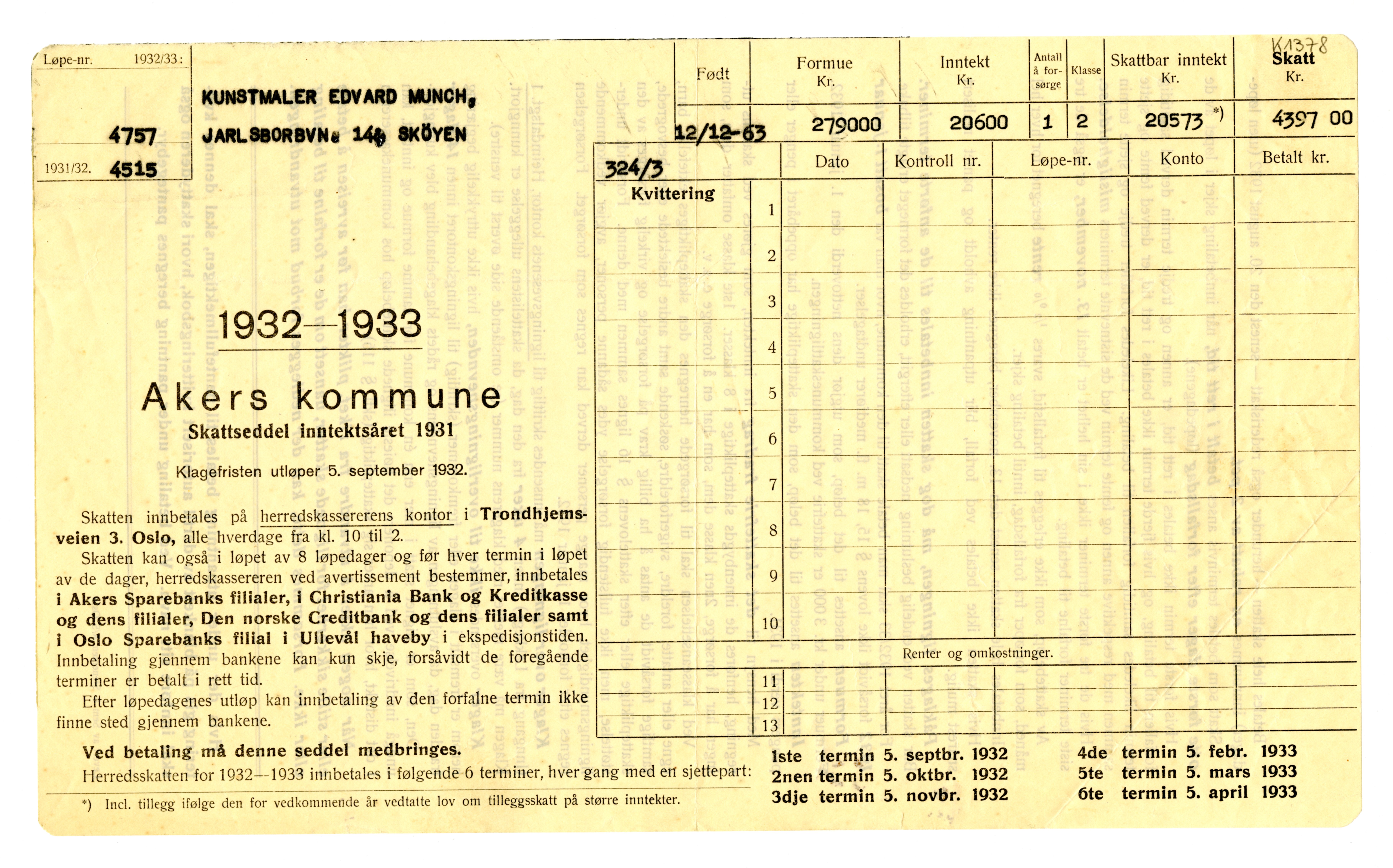 MM K 1378, Munchmuseet. Ikke datert. Brev fra Akers skattedistrikt.