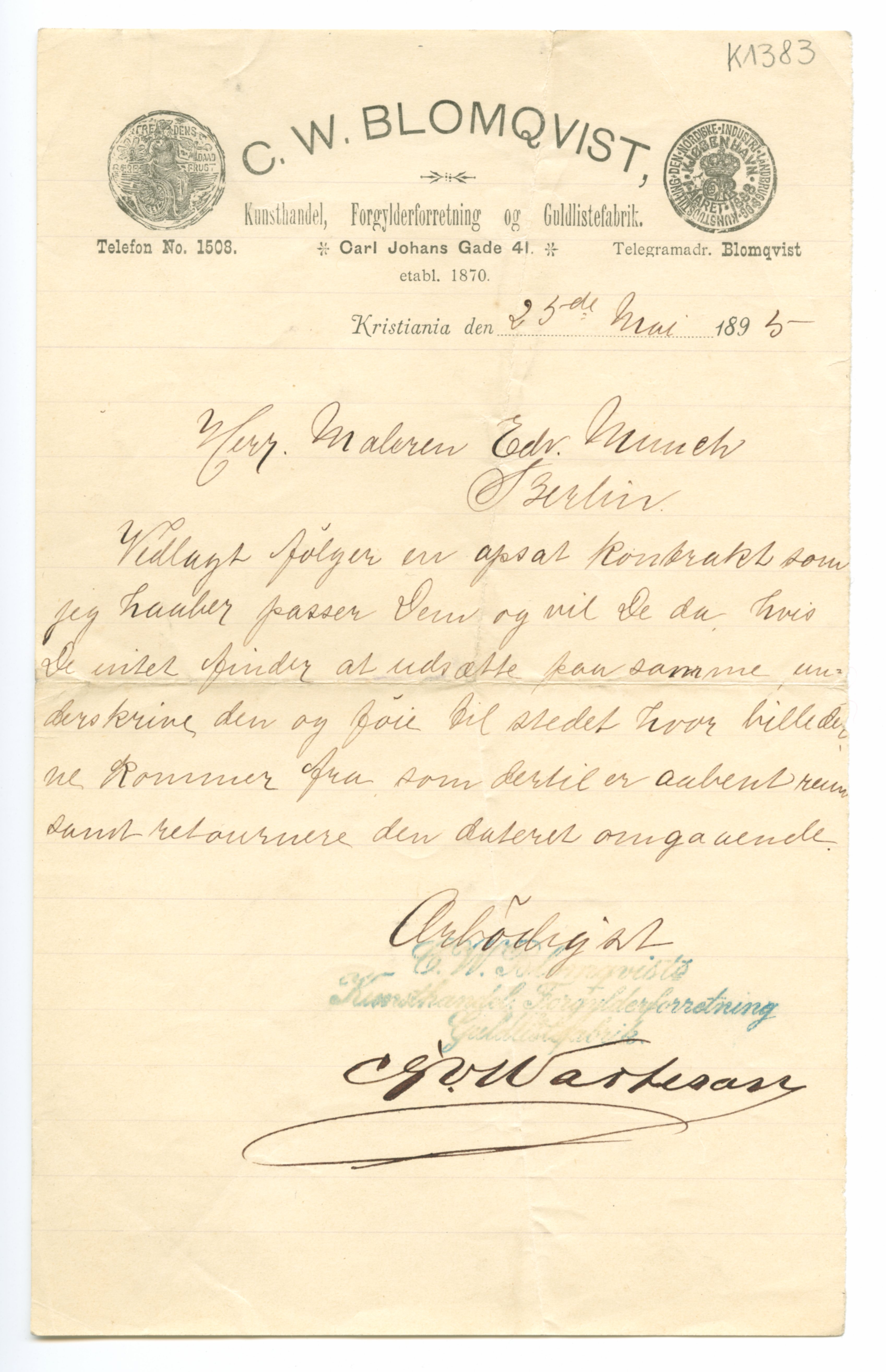 MM K 1383, Munchmuseet. Datert 25.05.1895. Brev fra Walfrid Wasteson, C. W. Blomqvist.