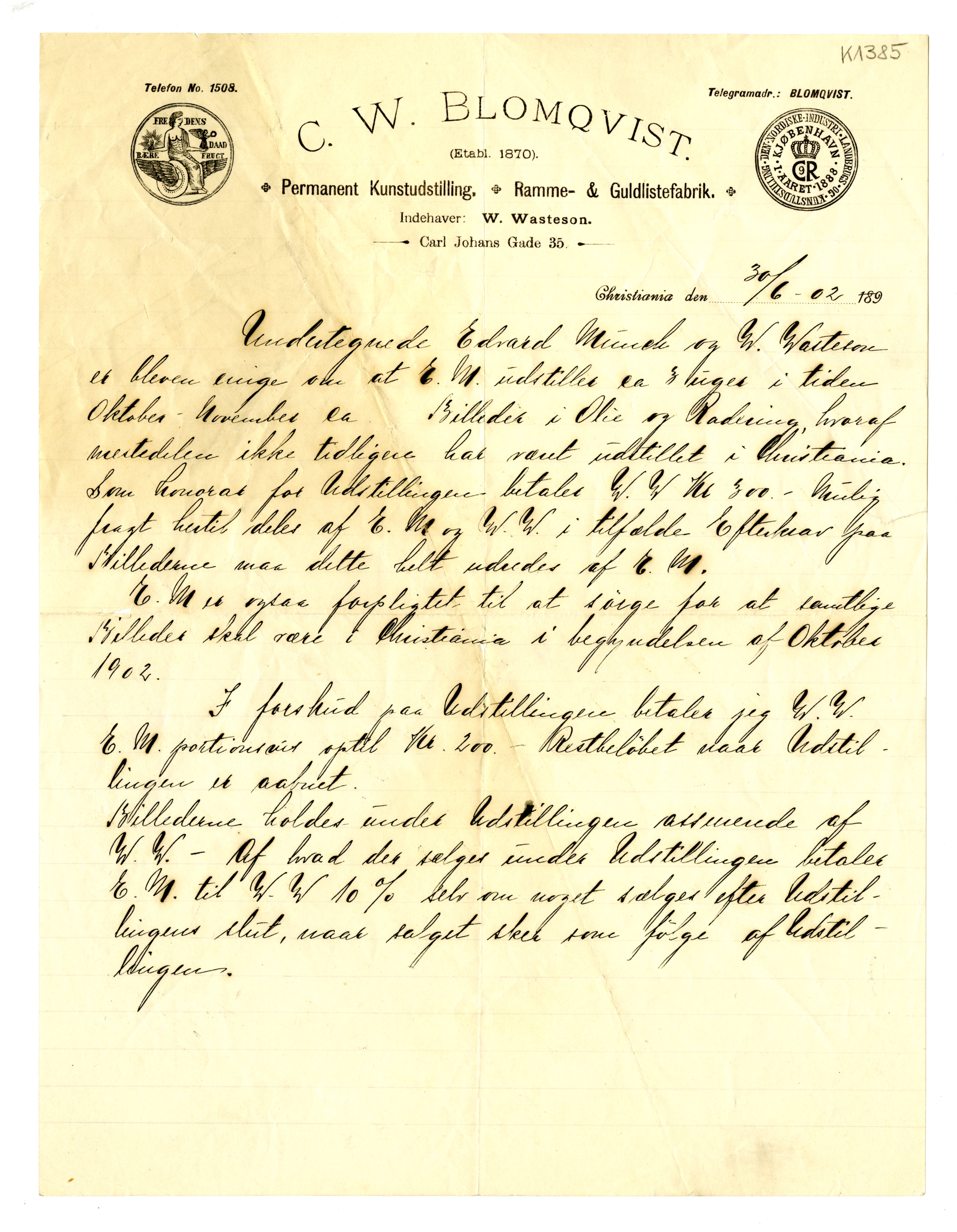 MM K 1385, Munchmuseet. Datert 30.06.1902. Brev fra Walfrid Wasteson, C. W. Blomqvist.