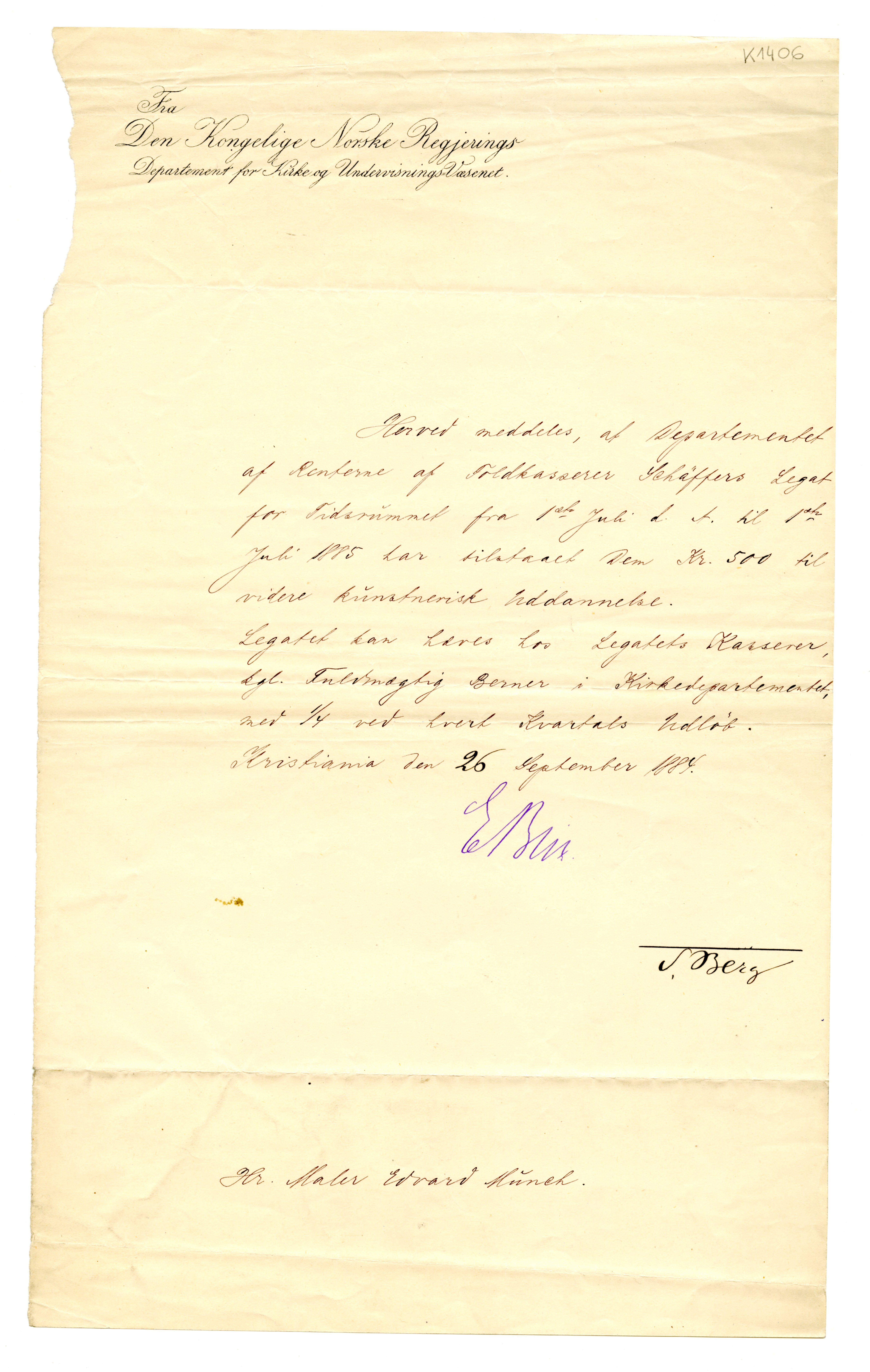 MM K 1406, Munchmuseet. Datert 26.09.1884. Brev fra S. Berg, E. Blix, Departement for Kirke og Undervisnings-Væsenet (og andre stipendier).