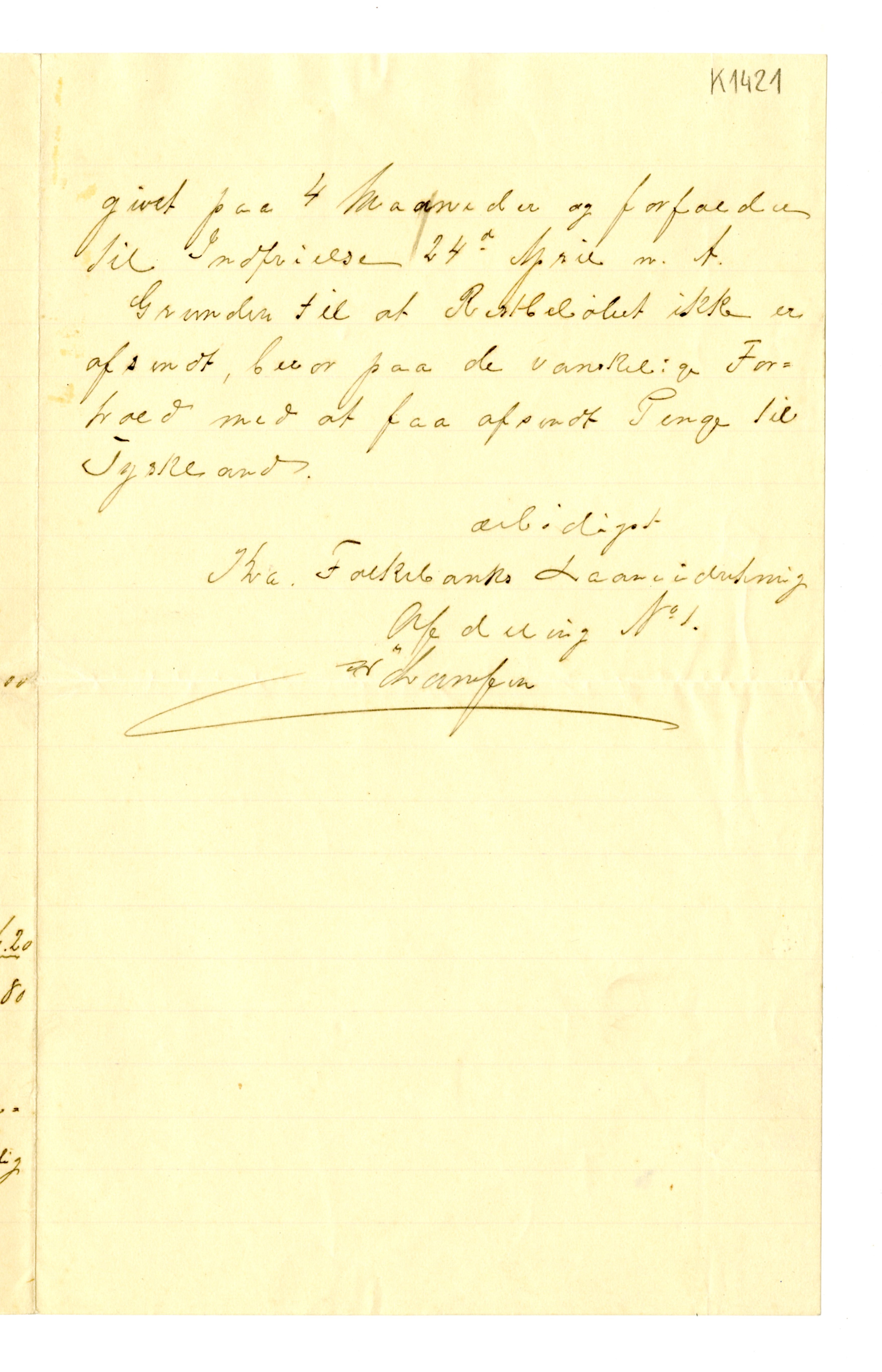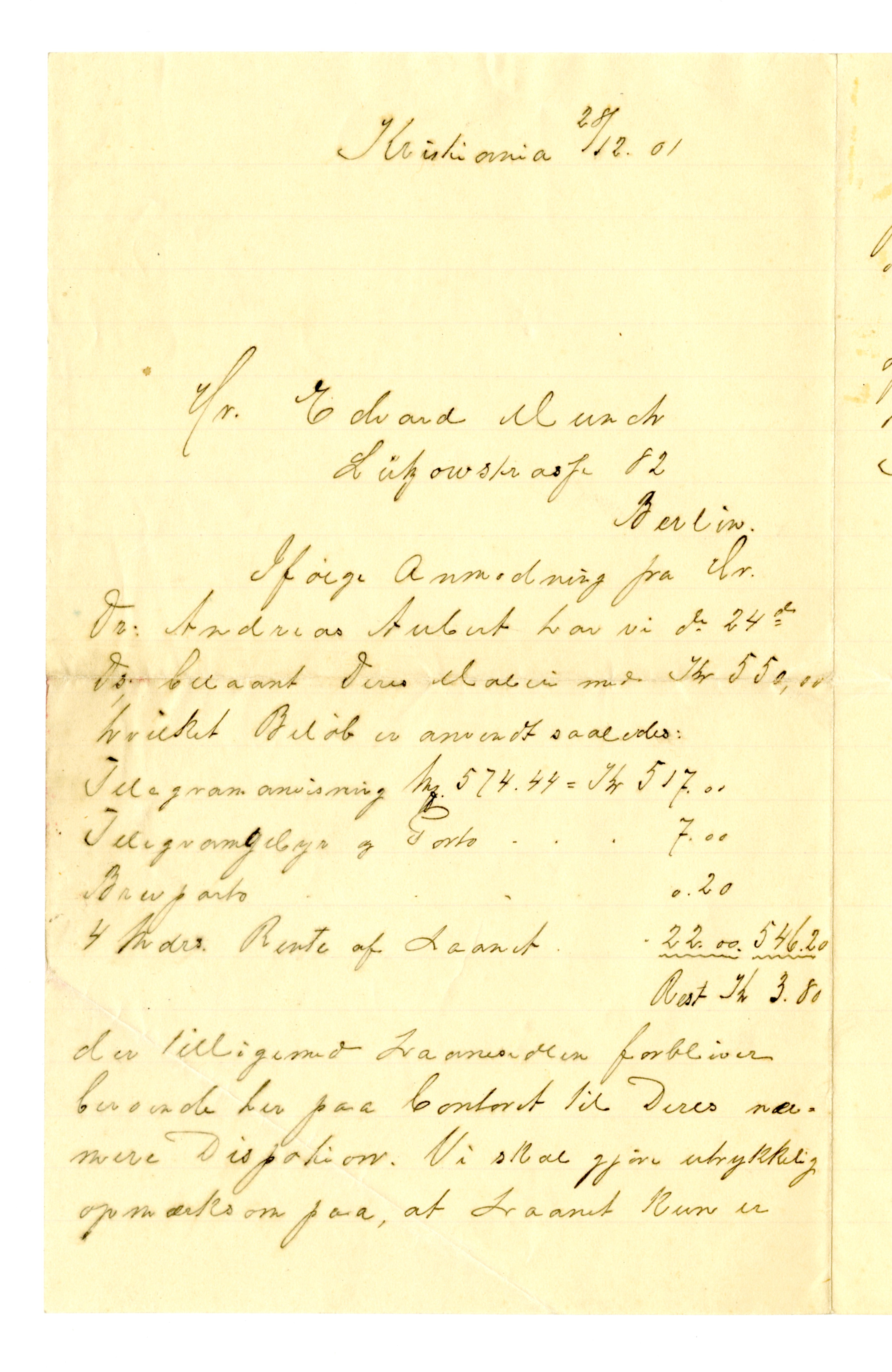 MM K 1421, Munchmuseet. Datert 28.12.1901. Brev fra Kristiania Folkebank.