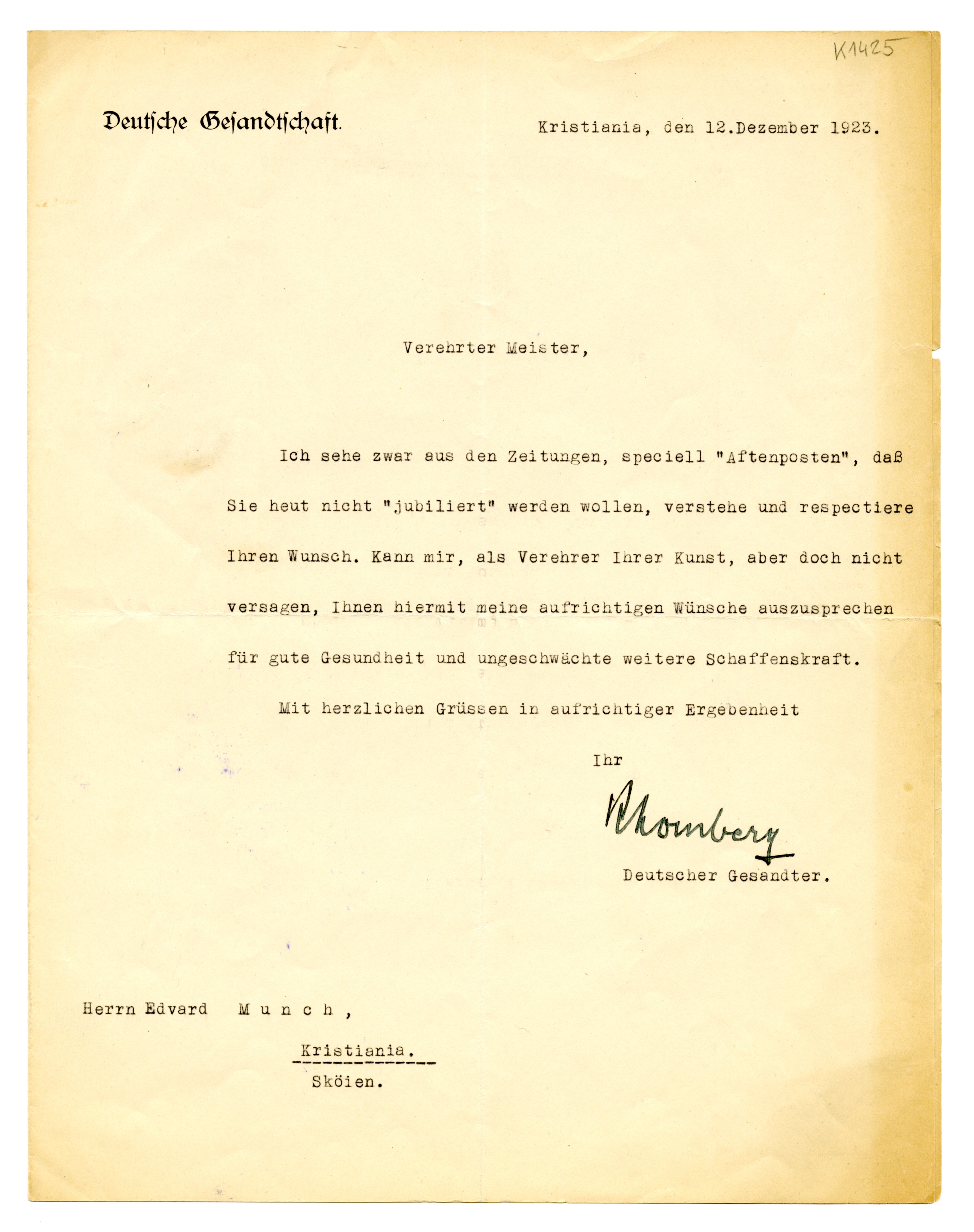 MM K 1425, Munchmuseet. Datert 12.12.1923. Brev fra Edmund Rhomberg, Deutsche Gesandschaft.