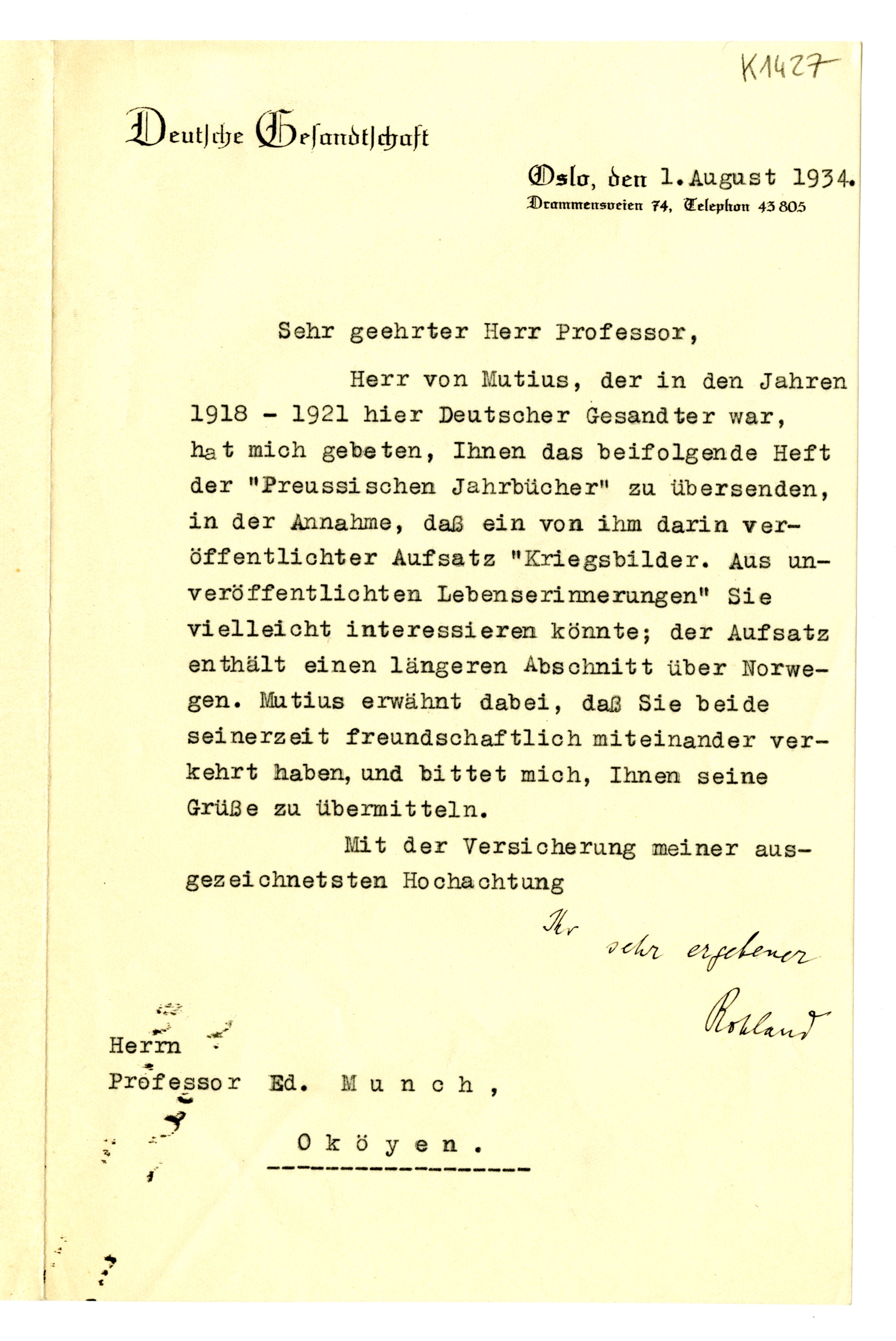 MM K 1427, Munchmuseet. Datert 01.08.1934. Brev fra Rohland, Deutsche Gesandschaft.